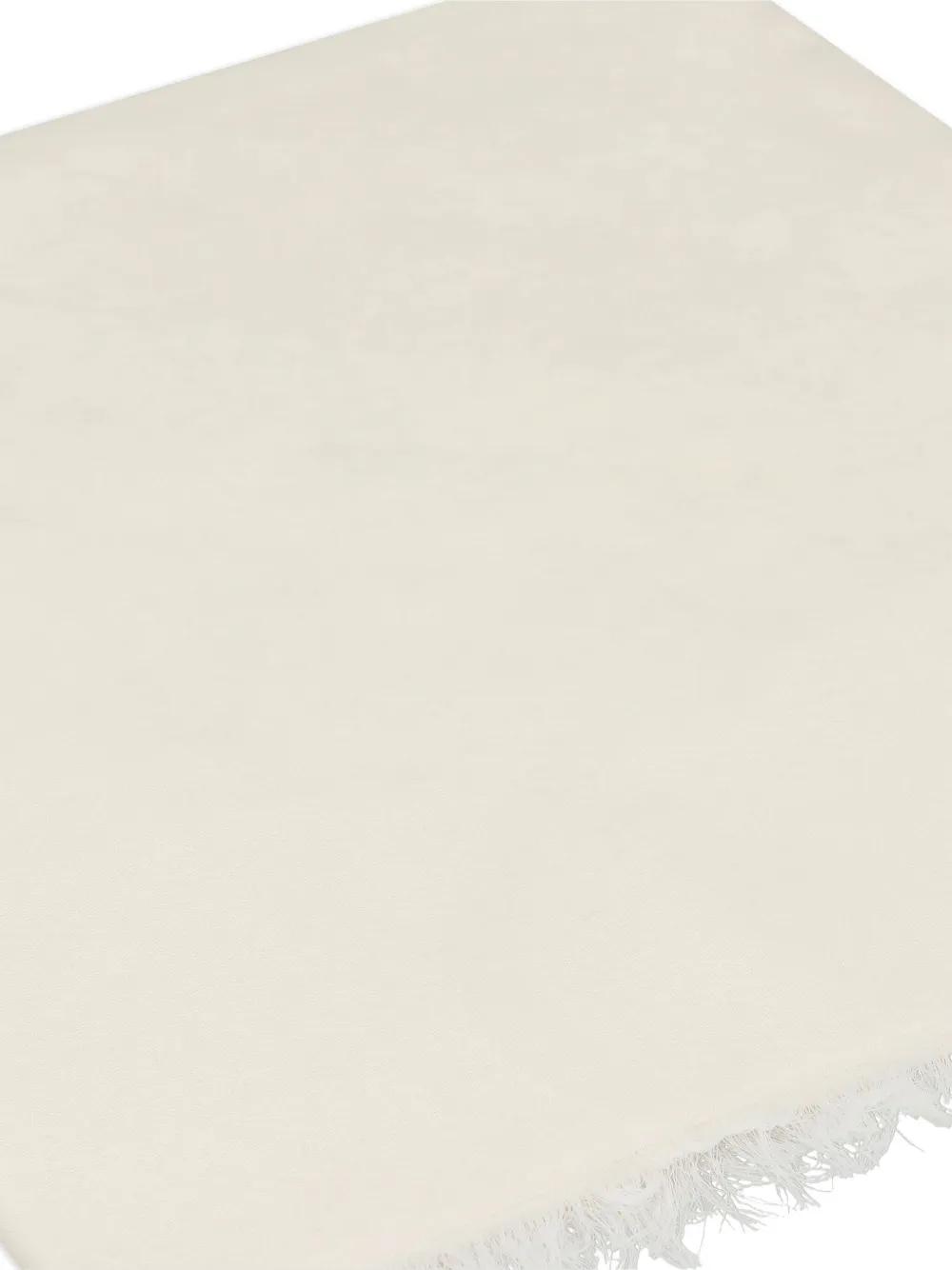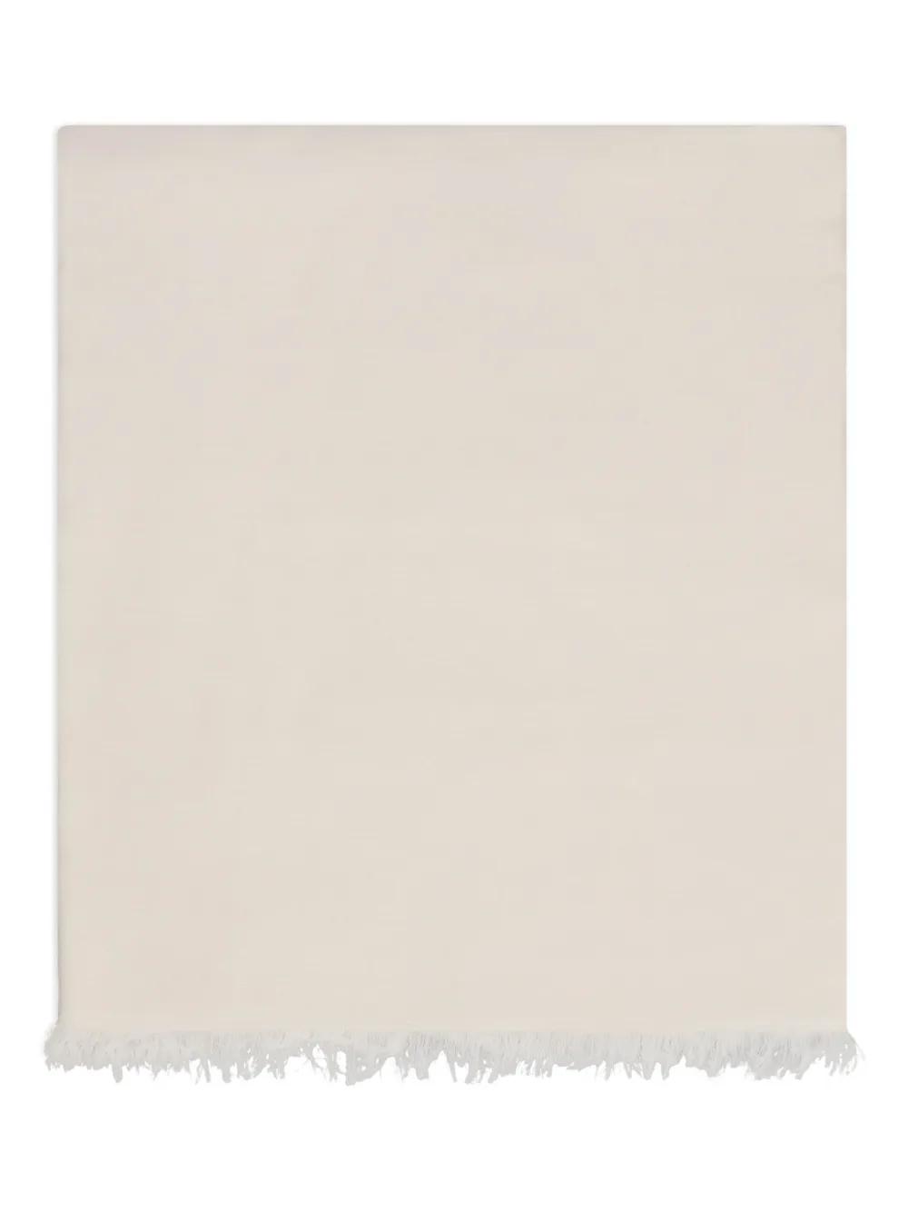 light brown virgin wool fine knit logo print to the front fringed edge rectangle shape wraparound style