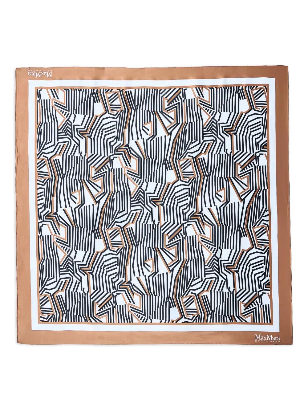 light brown virgin wool fine knit logo print to the front fringed edge rectangle shape wraparound style
