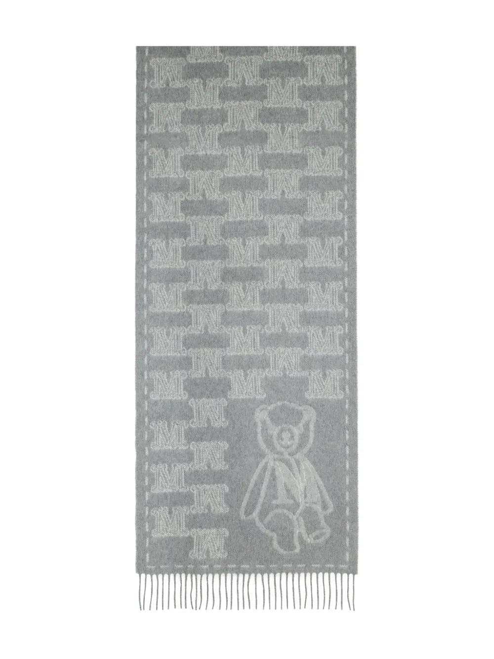grey cashmere all-over M monogram jacquard pattern teddy-bear motif fringed edges