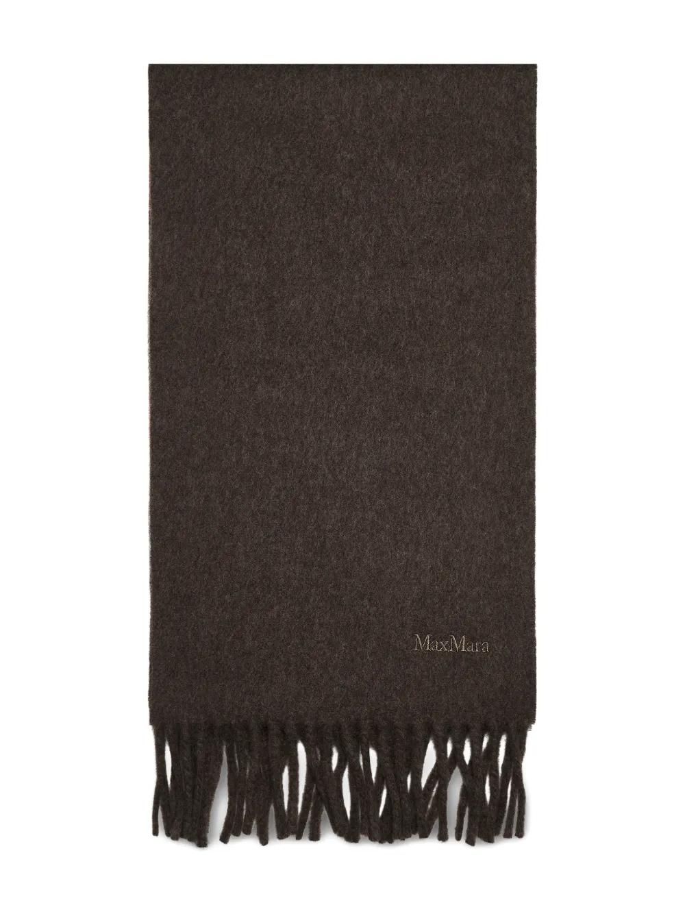light brown virgin wool fine knit logo print to the front fringed edge rectangle shape wraparound style