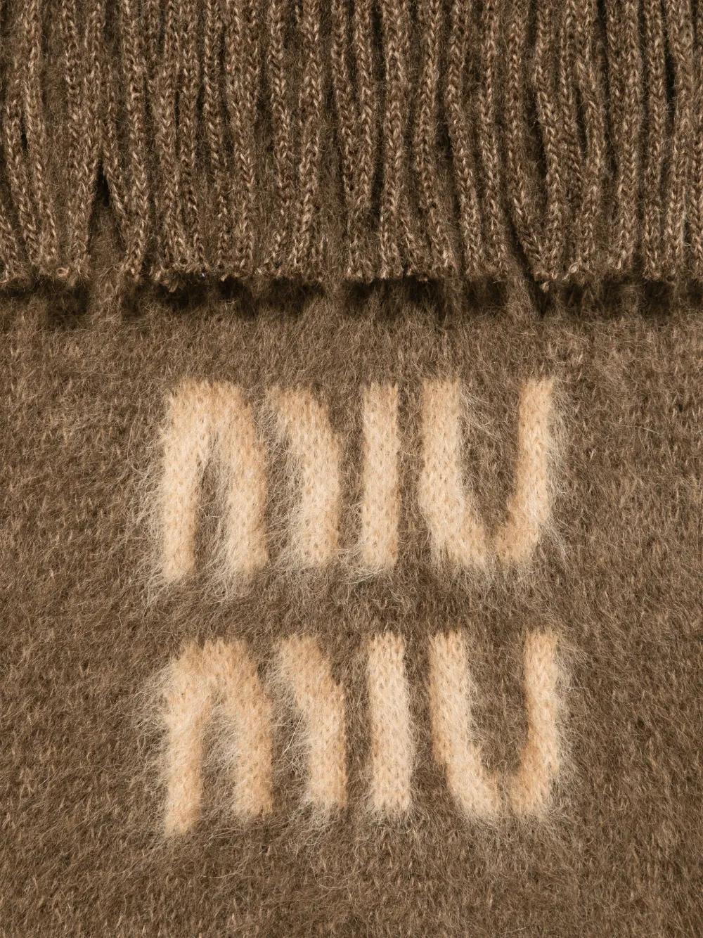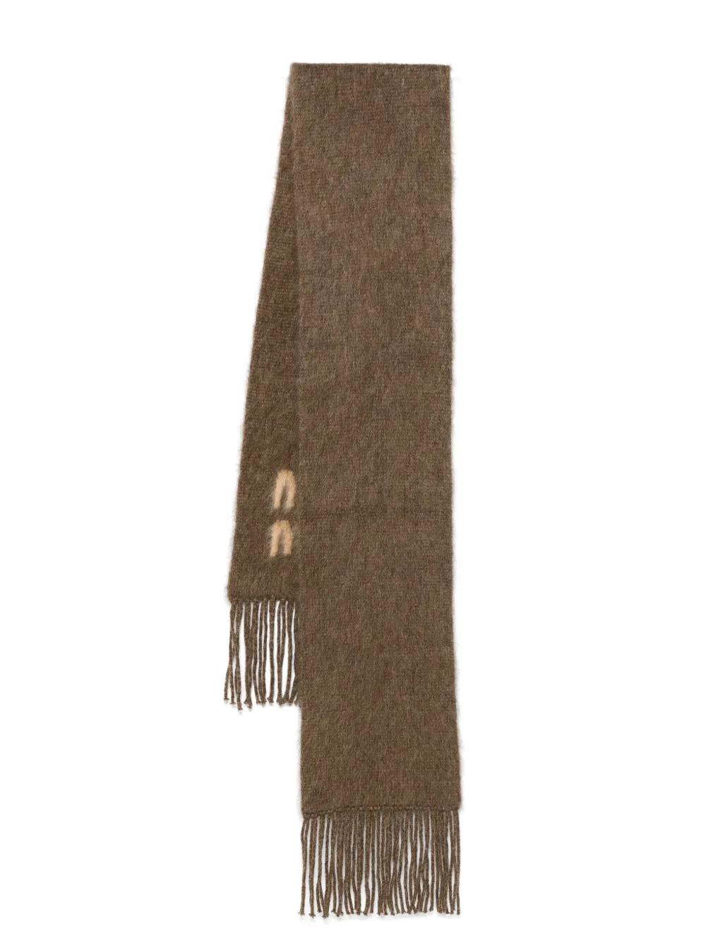 tobacco brown mohair blend knitted construction brushed finish intarsia-knit logo fringed edge wraparound style