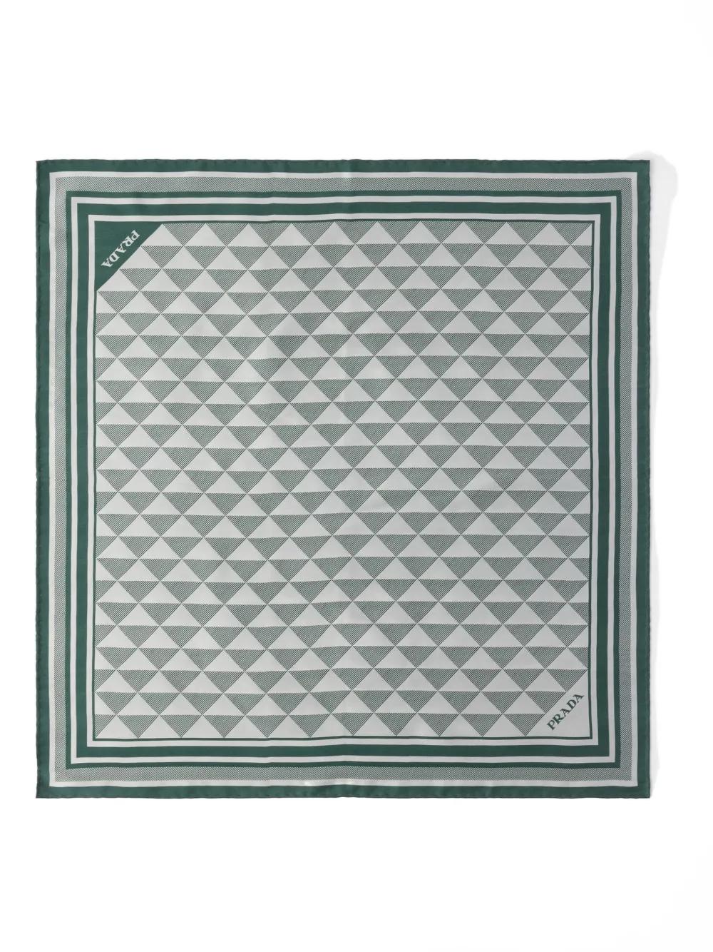 green silk all-over geometric pattern logo detail finished edge square shape
