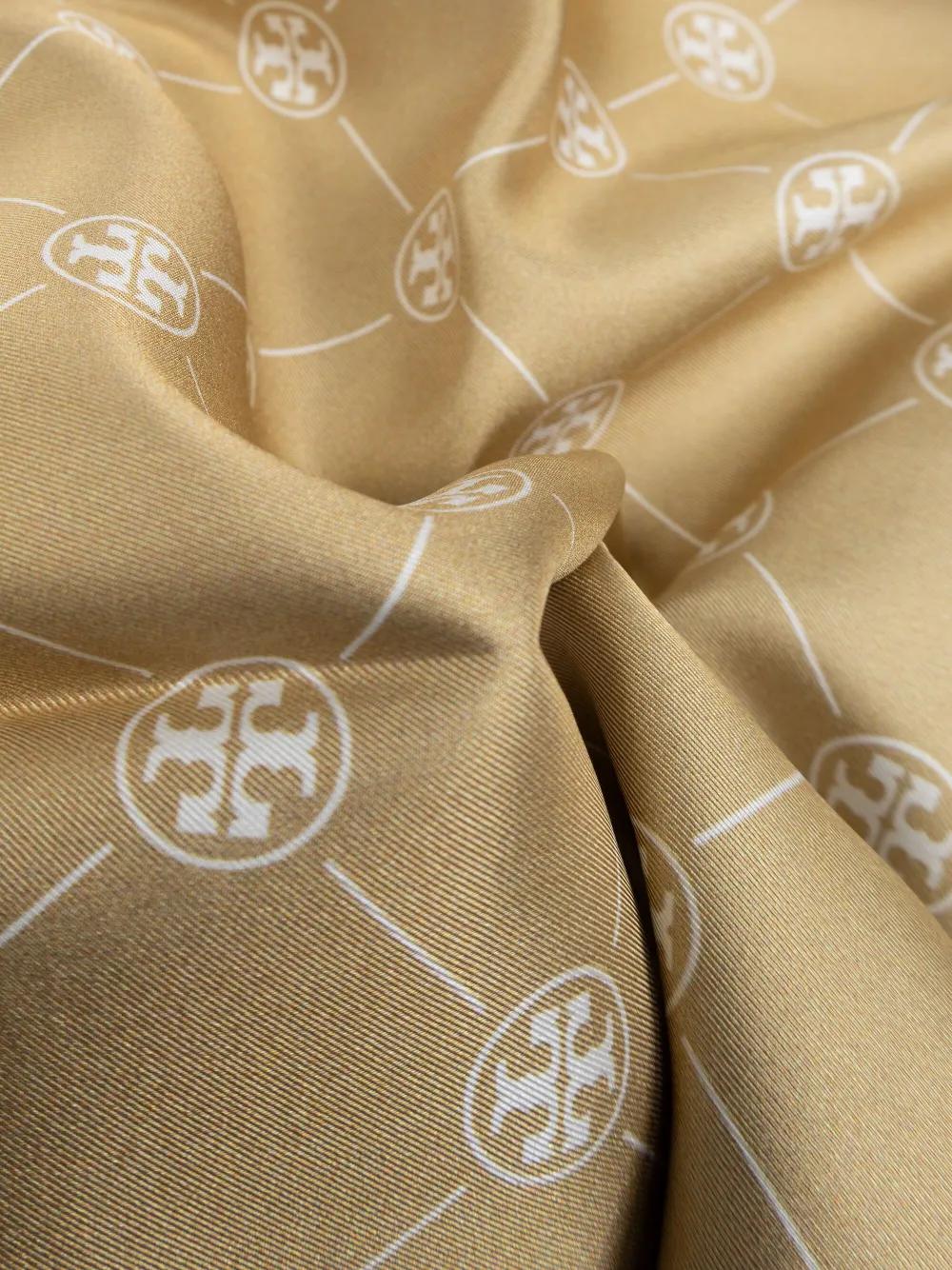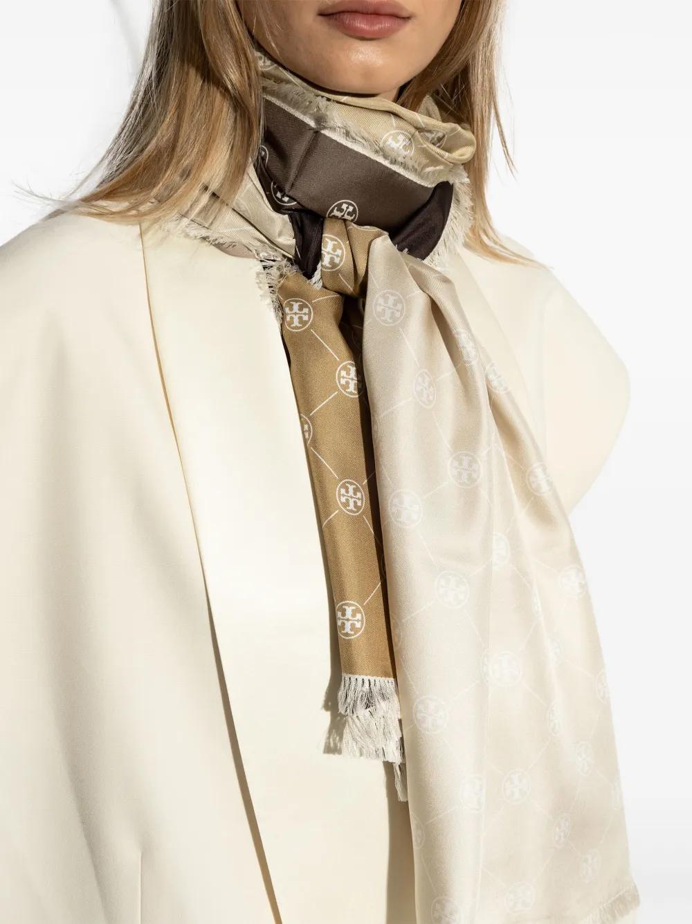 light brown logo pattern fringe trim layered styling versatile wear options elegant finish soft drape