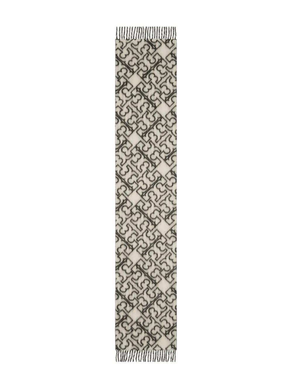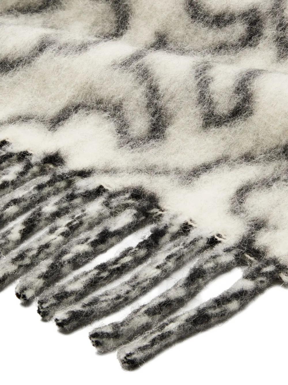 black ivory logo pattern fringed edges wool rectangular shape soft texture