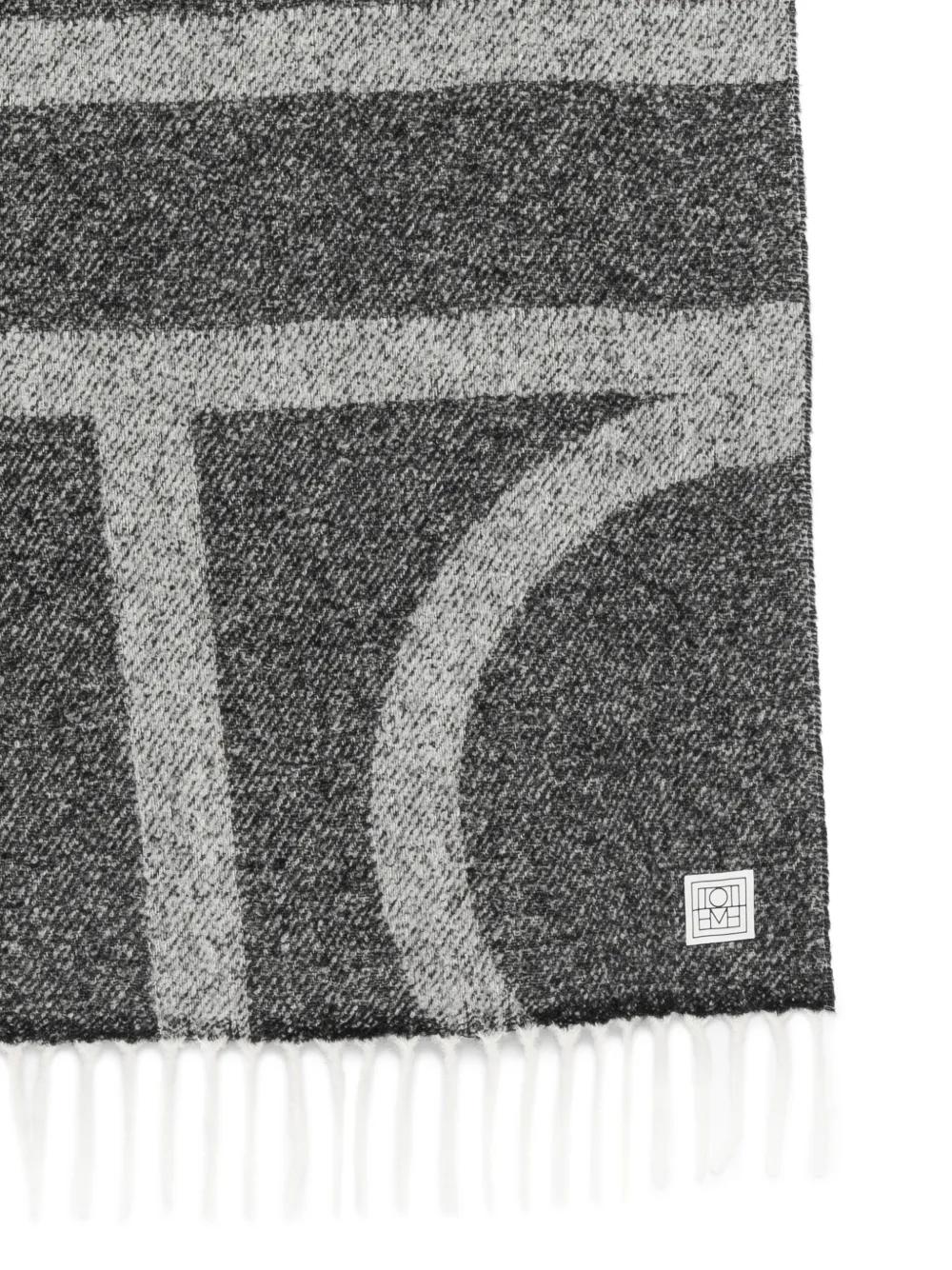 light brown virgin wool fine knit logo print to the front fringed edge rectangle shape wraparound style