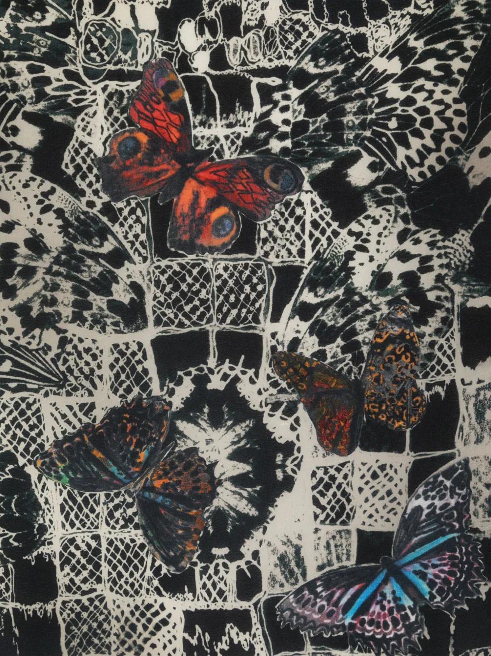 indigo blue/multicolour organic silk voile butterfly print logo print to the front square shape solid border