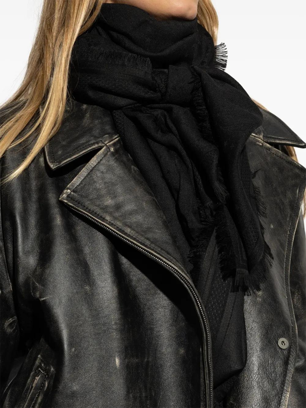 smoky black wool-silk blend tonal design monogram jacquard square shape frayed edge