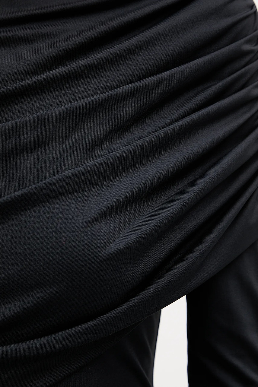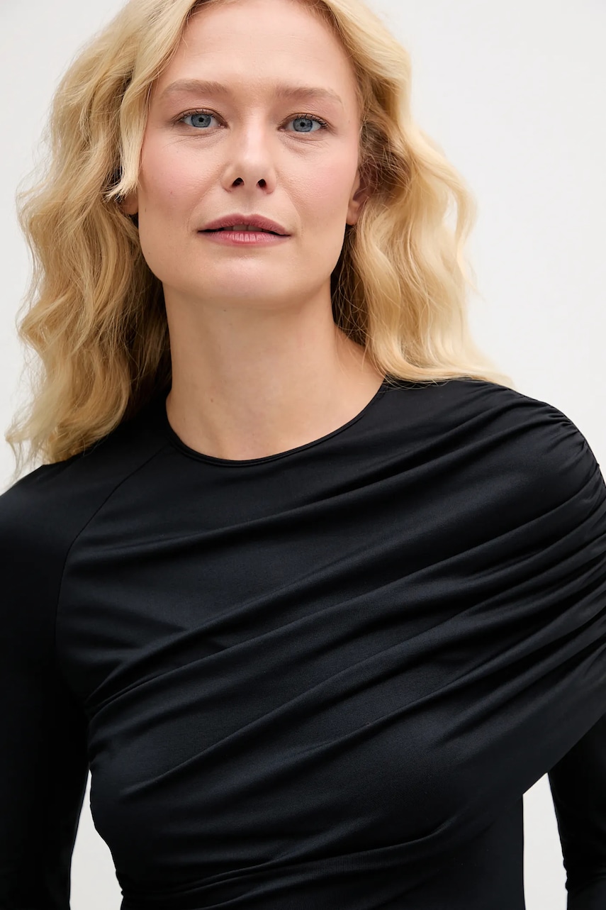 - Dopasowany, podkreślający sylwetkę fason. - Model z ozdobnymi marszczeniami. - Klasyczny, okrągły dekolt. - Cienka, elastyczna dzianina. - Długość rękawa(mierzona od dekoltu): 78 cm. - Długość: 58 cm. - Szerokość pod pachami: 38 cm. - Wymiary podane dla rozmiaru: S.