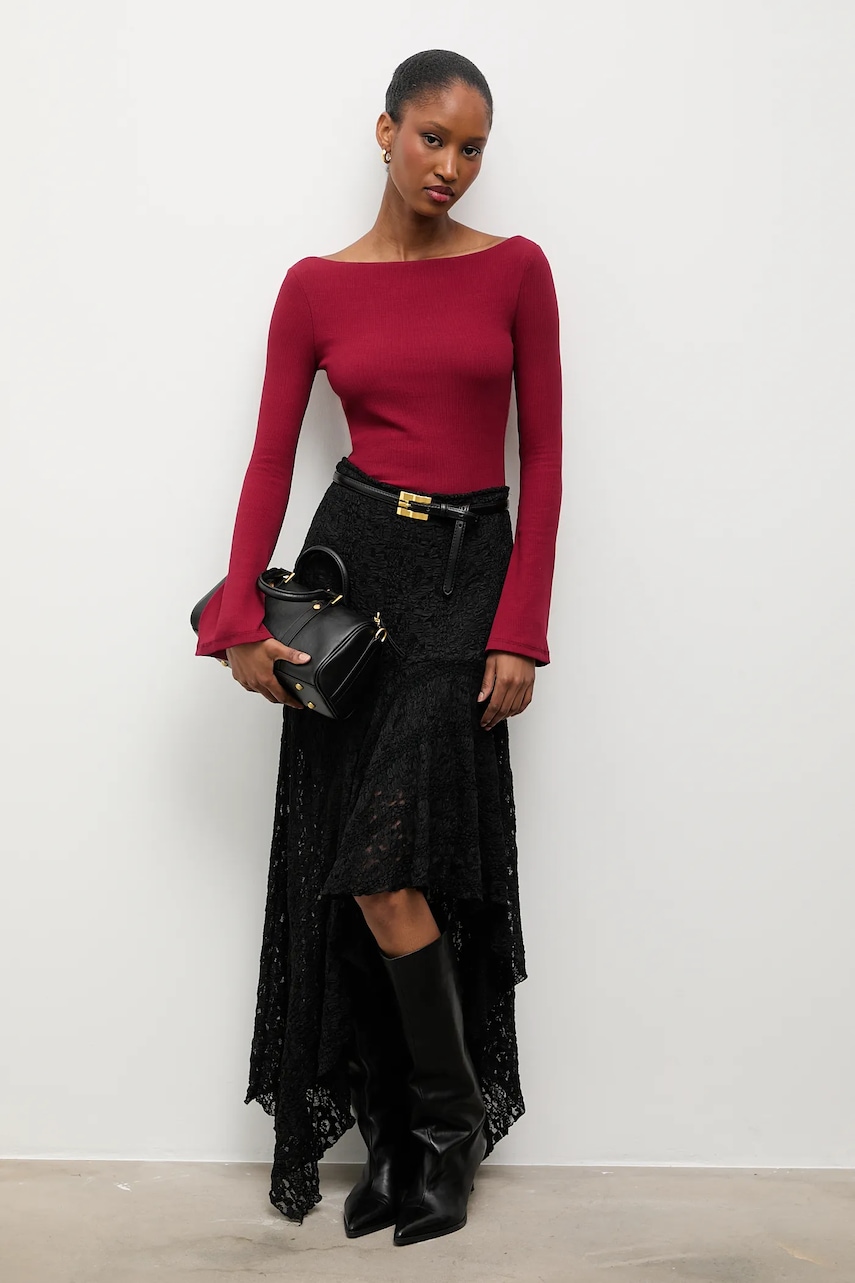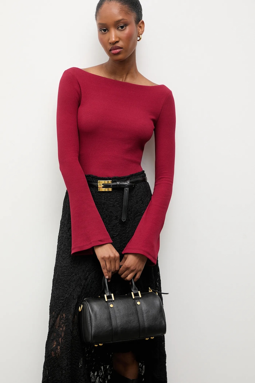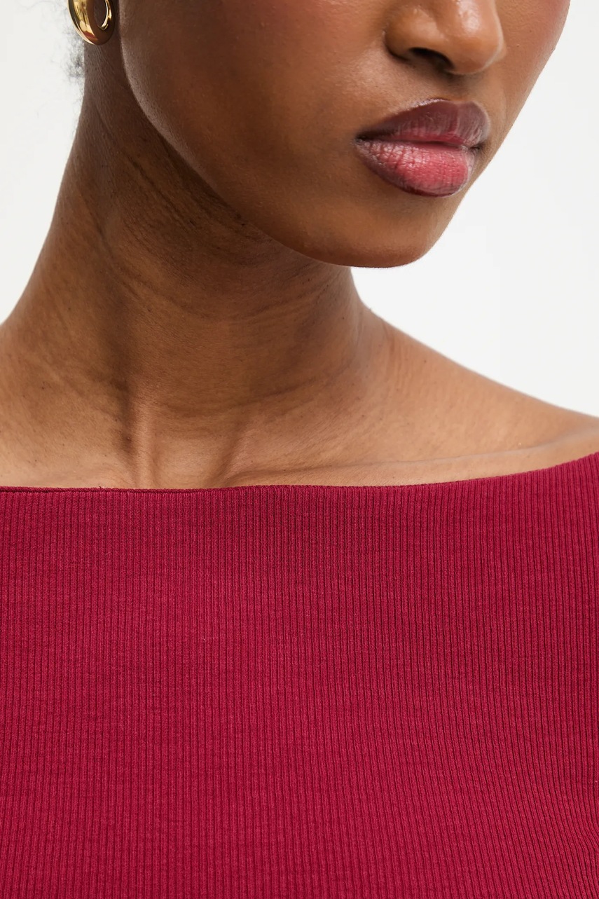 - Fason slim fit. - Dekolt typu łódka. - Prążkowana struktura materiału sprawia, że jest on niezwykle elastyczny i doskonale przylega do ciała. - Rozszerzany rękaw. - Długość rękawa: 59 cm. - Długość: 59 cm. - Szerokość pod pachami: 35 cm. - Wymiary podane dla rozmiaru: S.