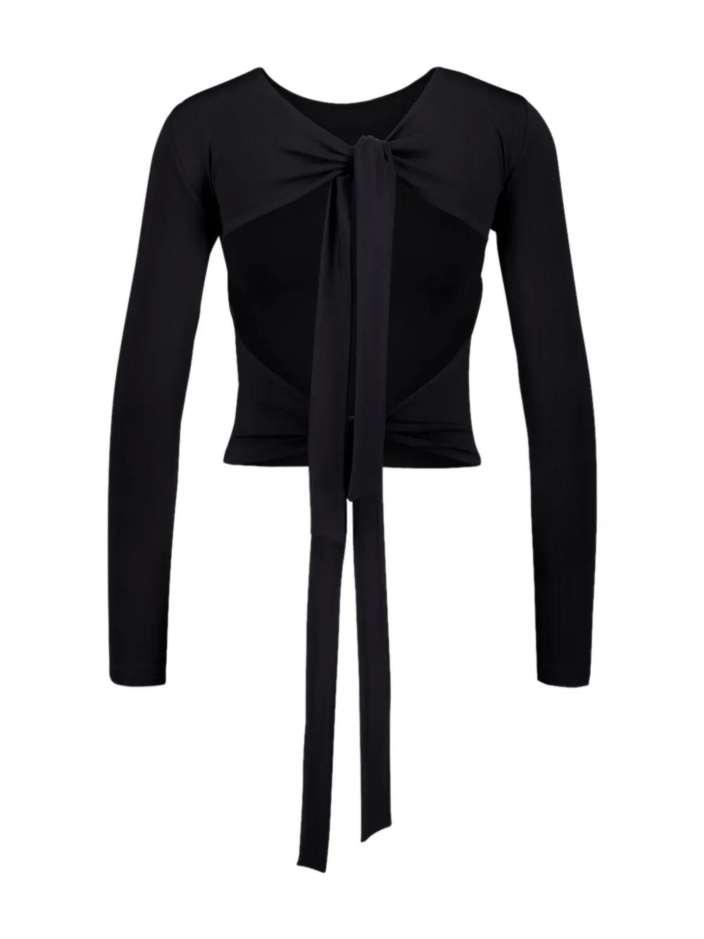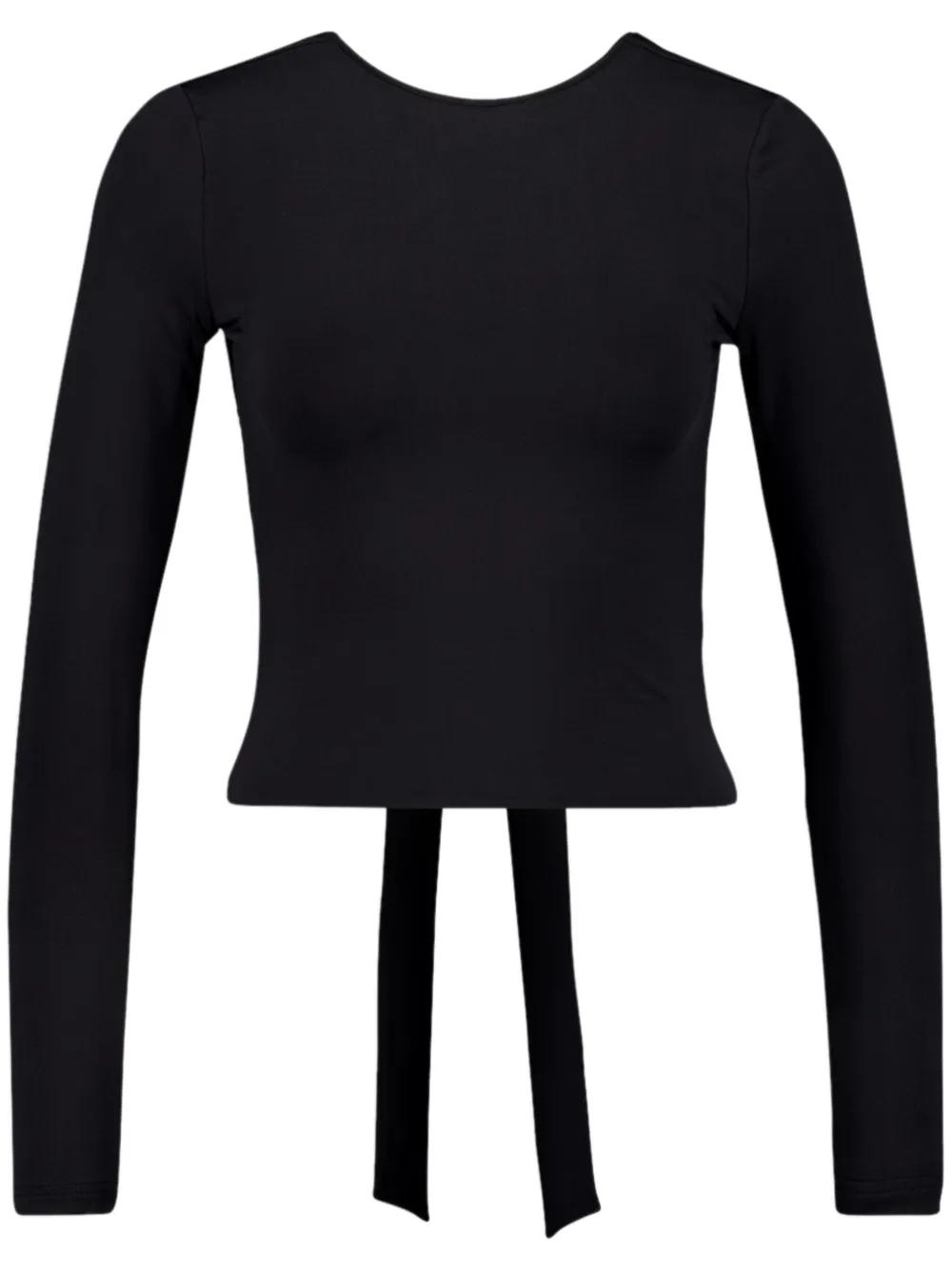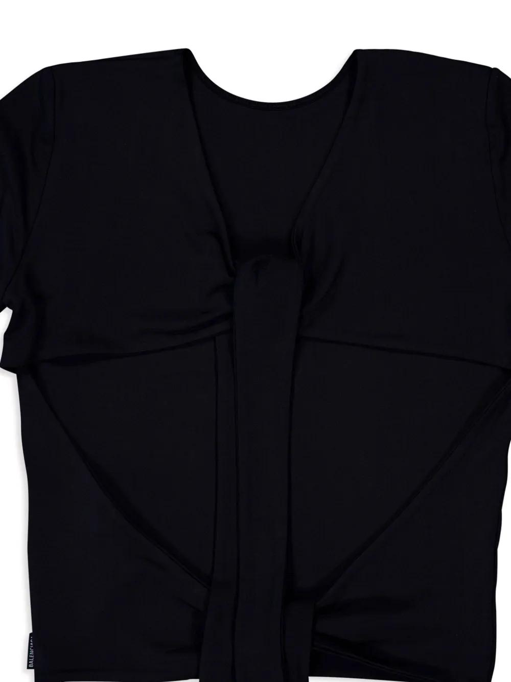 jet black stretch-design mini logo tag knot detailing crew neck rear tie fastening long sleeves open back straight hem