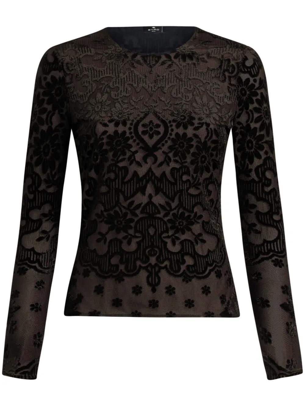 black velvet stretch-design floral motif full jacquard crew neck long sleeves straight hem