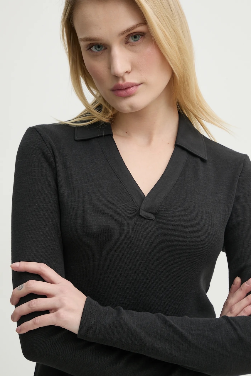 - Ten produkt został wykonany z bawełny organicznej. - Dopasowany, podkreślający sylwetkę fason. - Spiczasty dekolt. - Model z kołnierzykiem. - Cienka, elastyczna dzianina. - Długość rękawa: 61 cm. - Długość: 56 cm. - Szerokość pod pachami: 40 cm. - Wymiary podane dla rozmiaru: S.