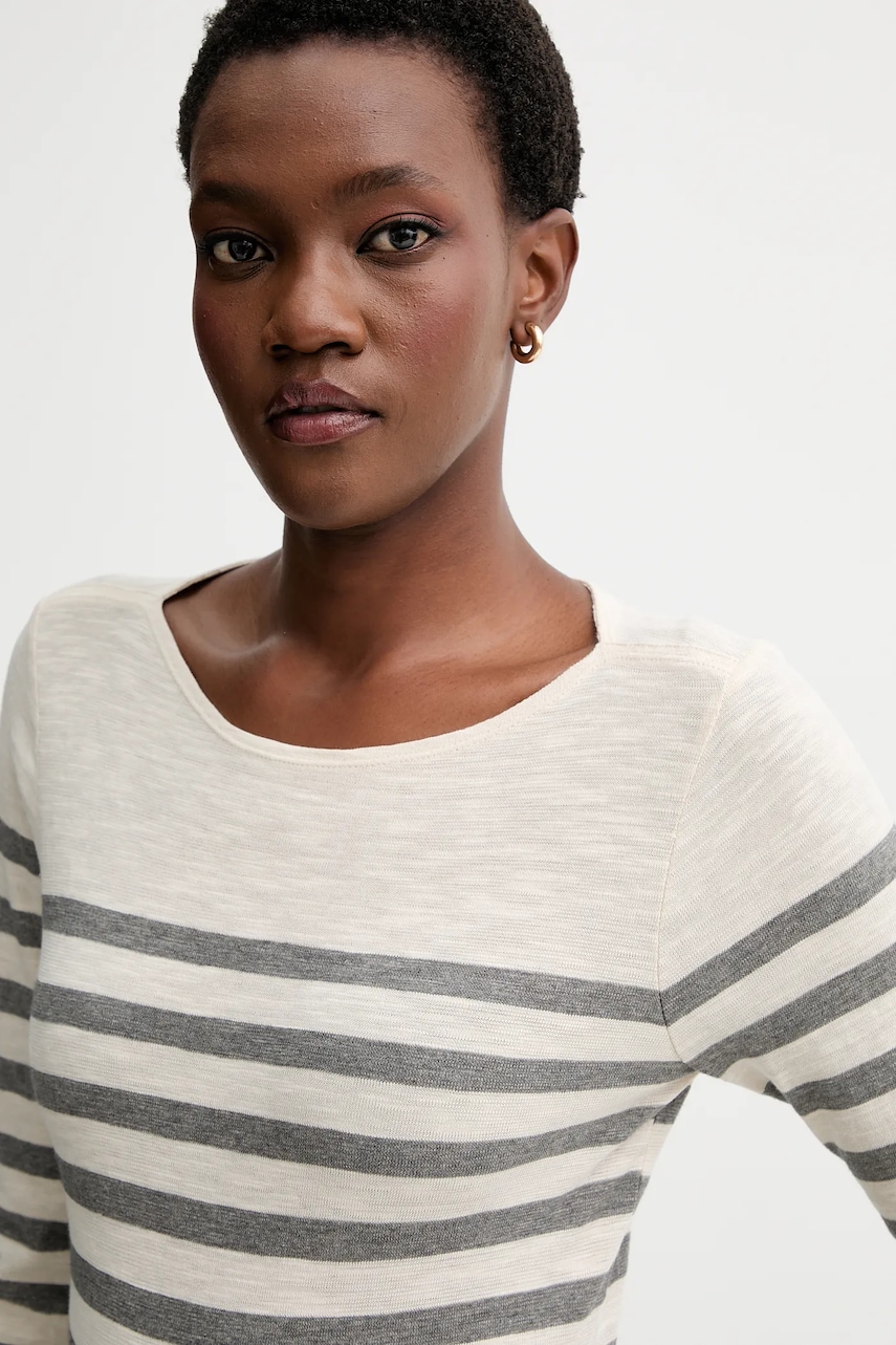 - Produkt wyprodukowany zgodnie z założeniami Fair Wear Foundation, organizacji zrzeszającej marki odzieżowe tworzące produkty w bardziej zrównoważony i etyczny sposób. Produkty oznaczone znakiem Fair Wear powstały w fabrykach, które pozytywnie przeszły zewnętrzny audyt i zapewniają pracownikom odpowiednie warunki pracy oraz wynagrodzenie. - Produkt oznaczony certyfikatem Global Organic Textile Standard (GOTS), gwarantującym wysoką jakość wyrobu, zgodną z określonymi normami ekologicznymi. Proces certyfikowania obejmuje wszystkie etapy wytwarzania produktów z materiałów naturalnych, od surowca aż po gotowy produkt. - Prosty, nie blokujący ruchów fason. - Dekolt typu łódka. - Długie, proste rękawy. - Długość rękawa: 67 cm. - Długość: 66 cm. - Szerokość pod pachami: 45 cm. - Wymiary podane dla rozmiaru: S.