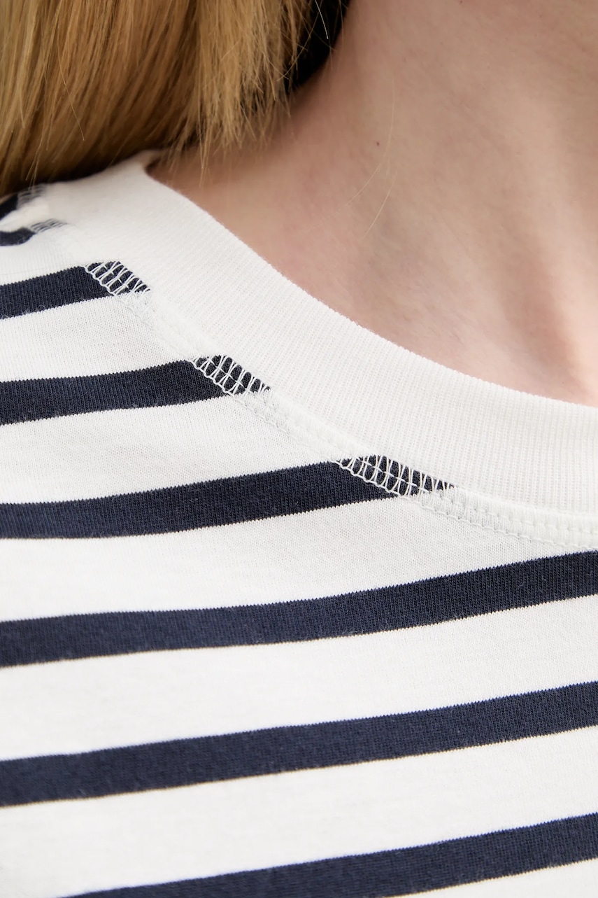 - Ten produkt został wykonany z bawełny organicznej. - Okrągły dekolt. - Wzór w pasy. - Obniżona linia ramion. - Prosty fason. - Długość rękawa: 75 cm. - Długość: 57 cm. - Szerokość pod pachami: 55 cm. - Wymiary podane dla rozmiaru: S.