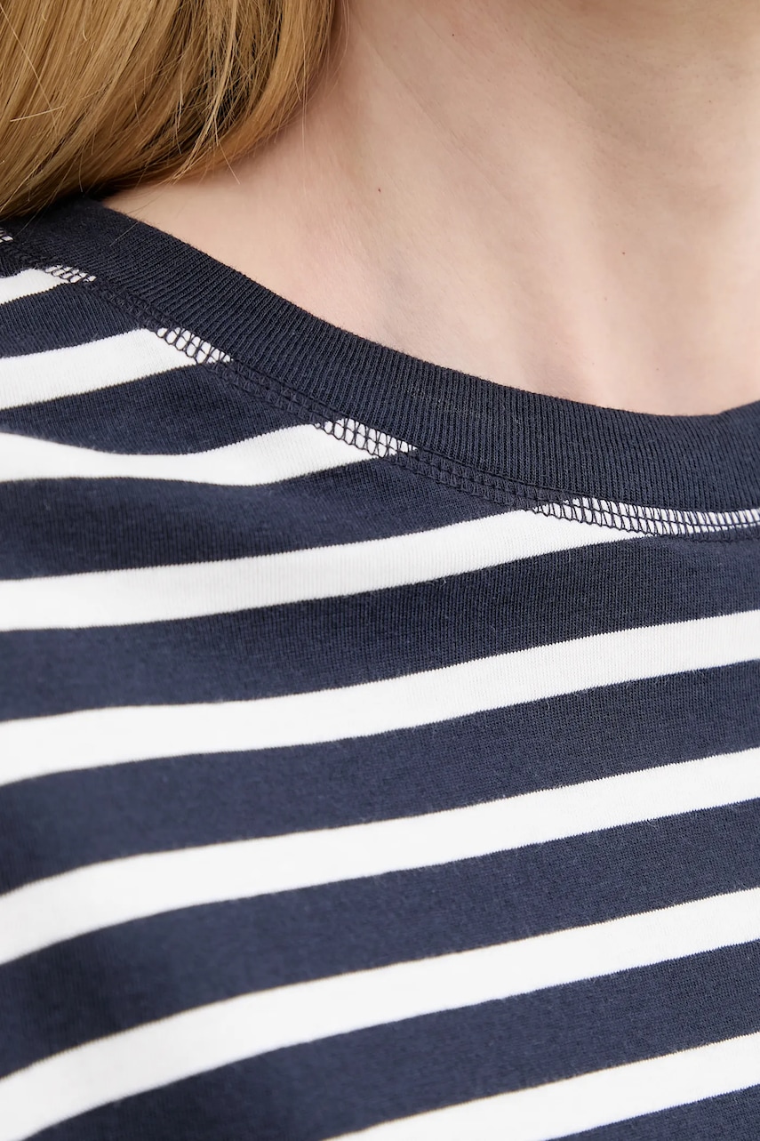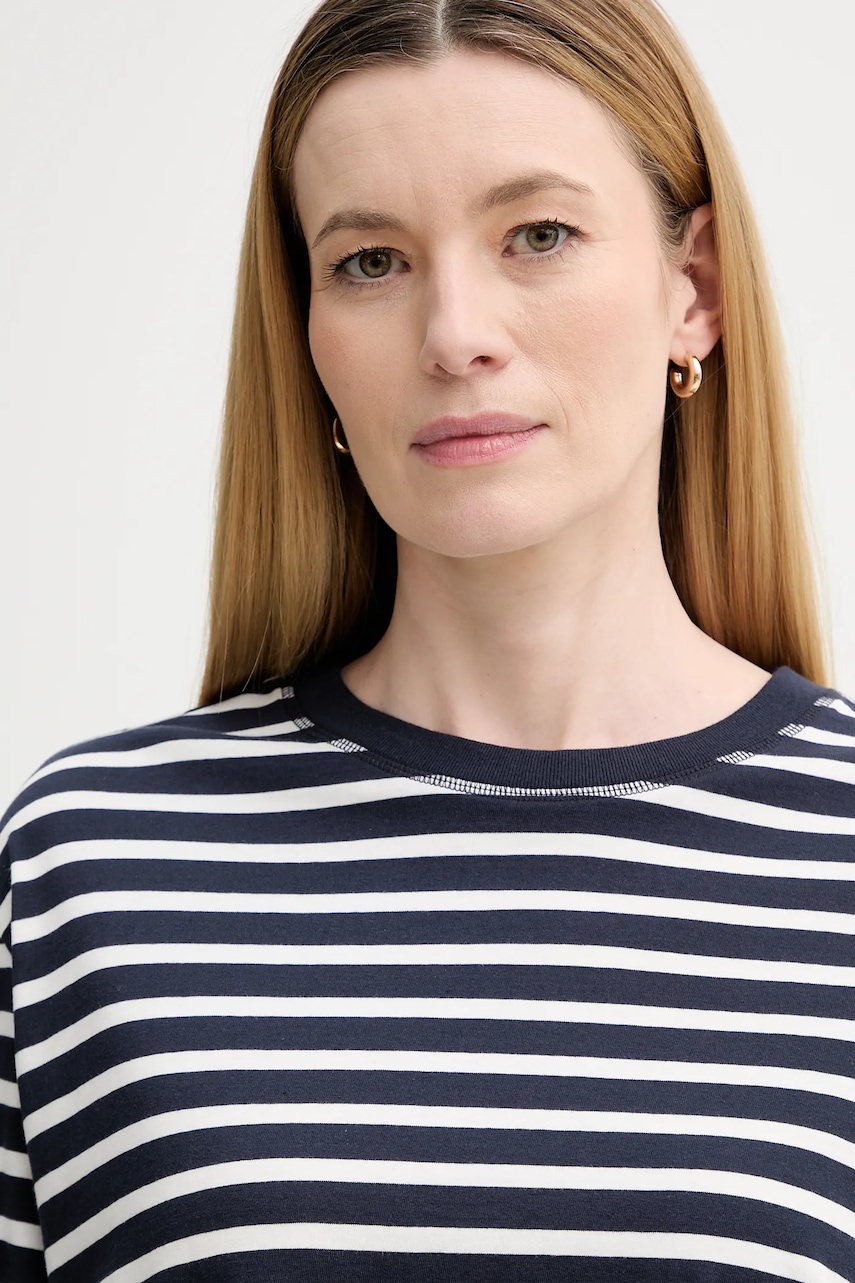 - Ten produkt został wykonany z bawełny organicznej. - Okrągły dekolt. - Wzór w pasy. - Obniżona linia ramion. - Prosty fason. - Długość rękawa: 75 cm. - Długość: 57 cm. - Szerokość pod pachami: 55 cm. - Wymiary podane dla rozmiaru: S.