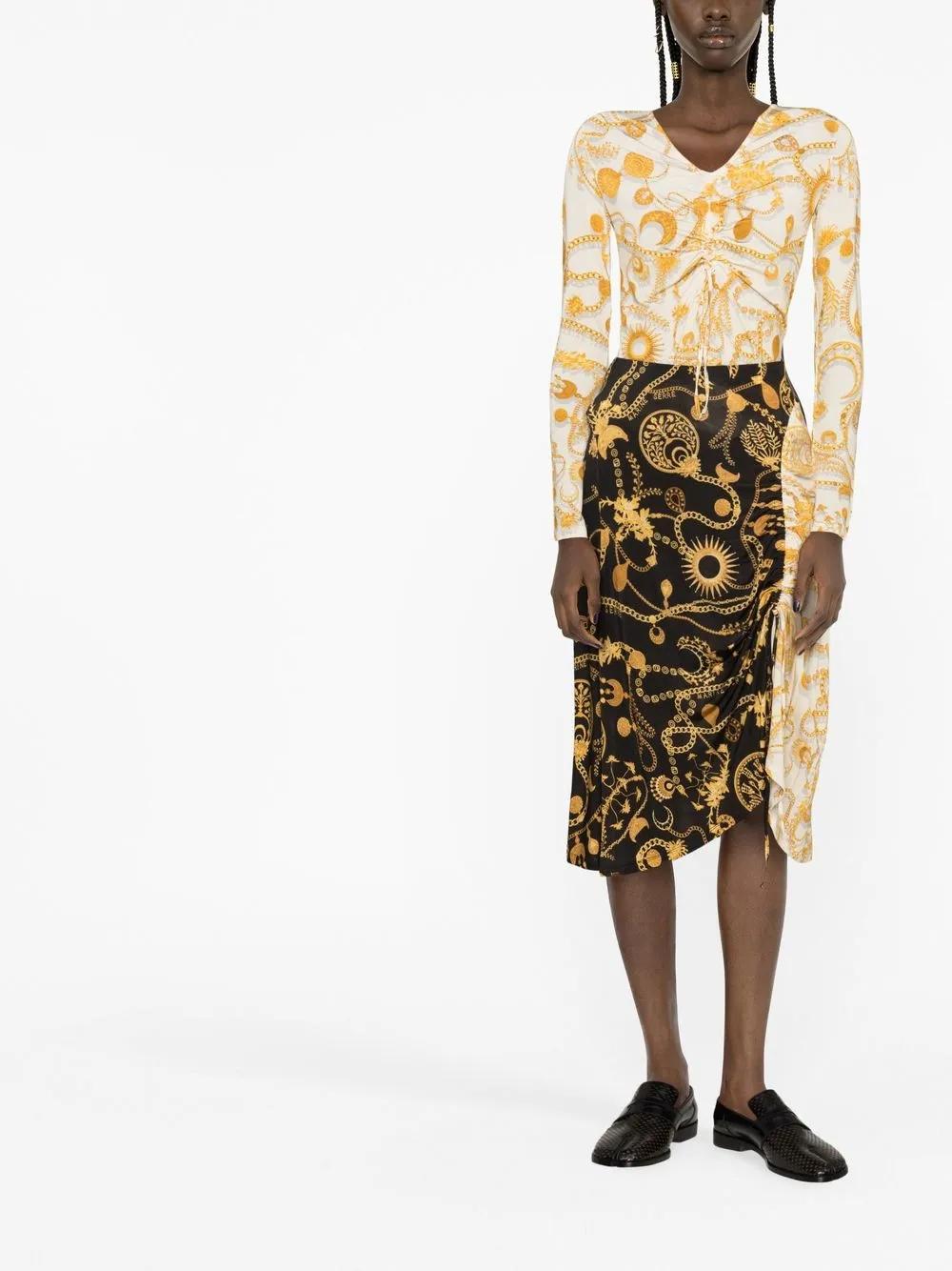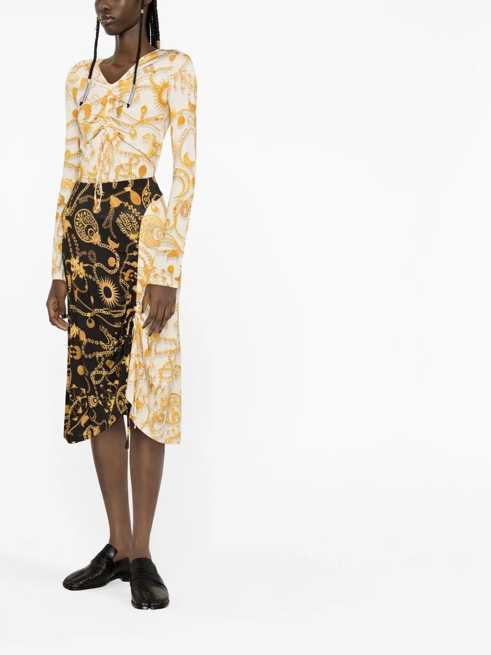white/yellow stretch-design all-over graphic print gathered detailing V-neck long sleeves straight hem