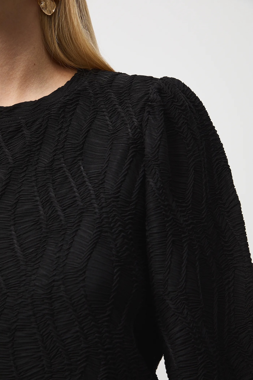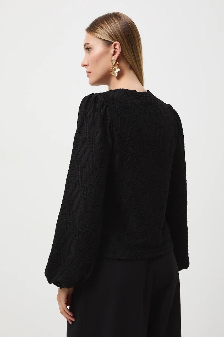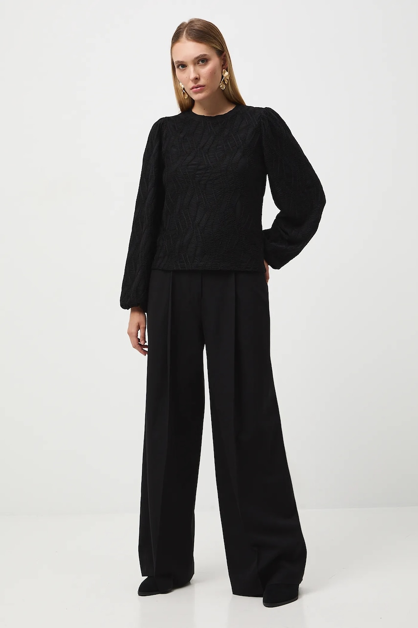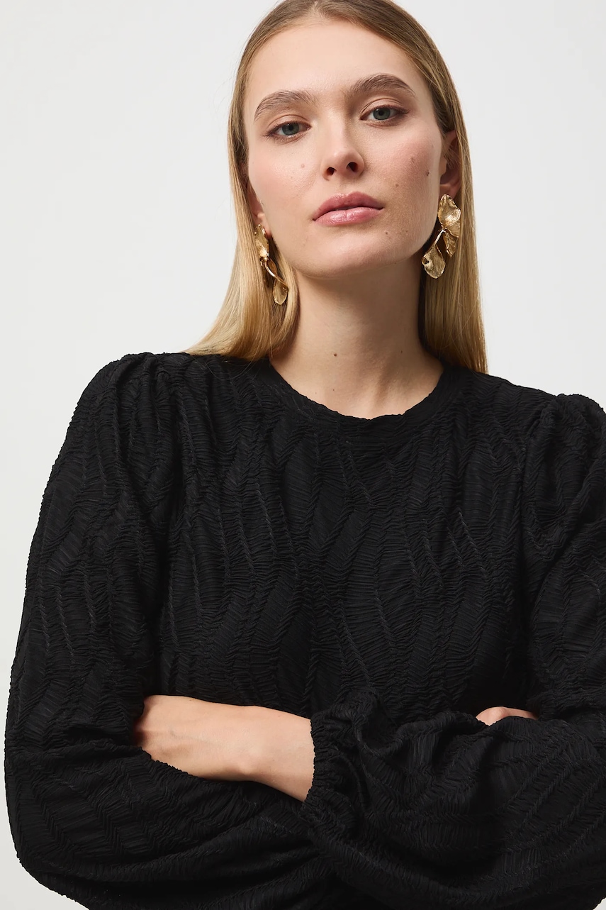 - Fason regular. - Długi rękaw. - Rękawy wykończone elastyczną gumką. - Okrągły dekolt. - Materiał z fakturą. - Żakardowa dzianina. - Długość: 57,5 cm. - Długość rękawa: 64,5 cm. - Szerokość w biuście: 47 cm. - Wymiary podane dla rozmiaru: S.