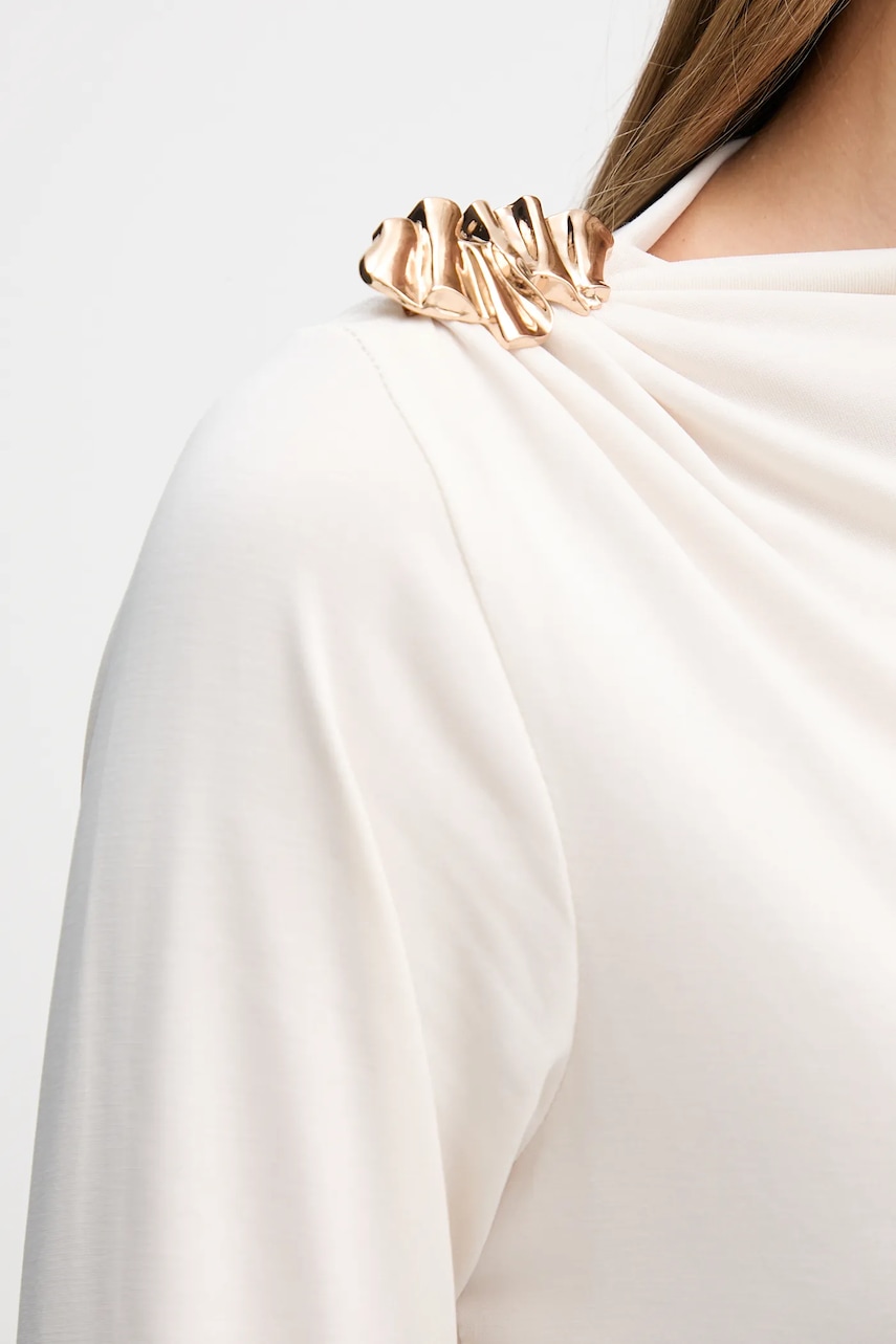 - Dopasowany, podkreślający sylwetkę fason. - Model z ozdobnymi marszczeniami. - Model z ozdobną aplikacją. - Efektowny dekolt typu woda. - Długość rękawa: 64 cm. - Długość: 54 cm. - Szerokość pod pachami: 47 cm. - Wymiary podane dla rozmiaru: S.