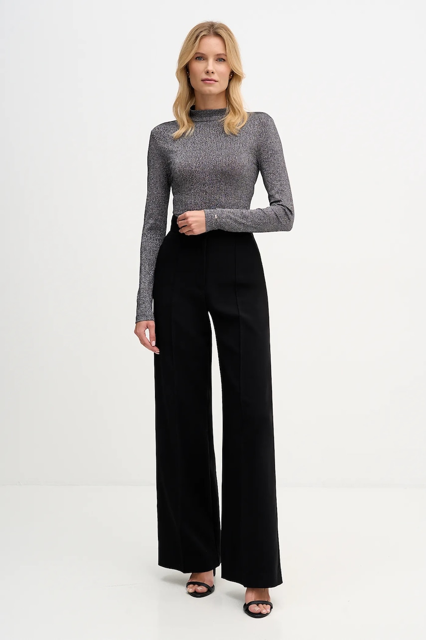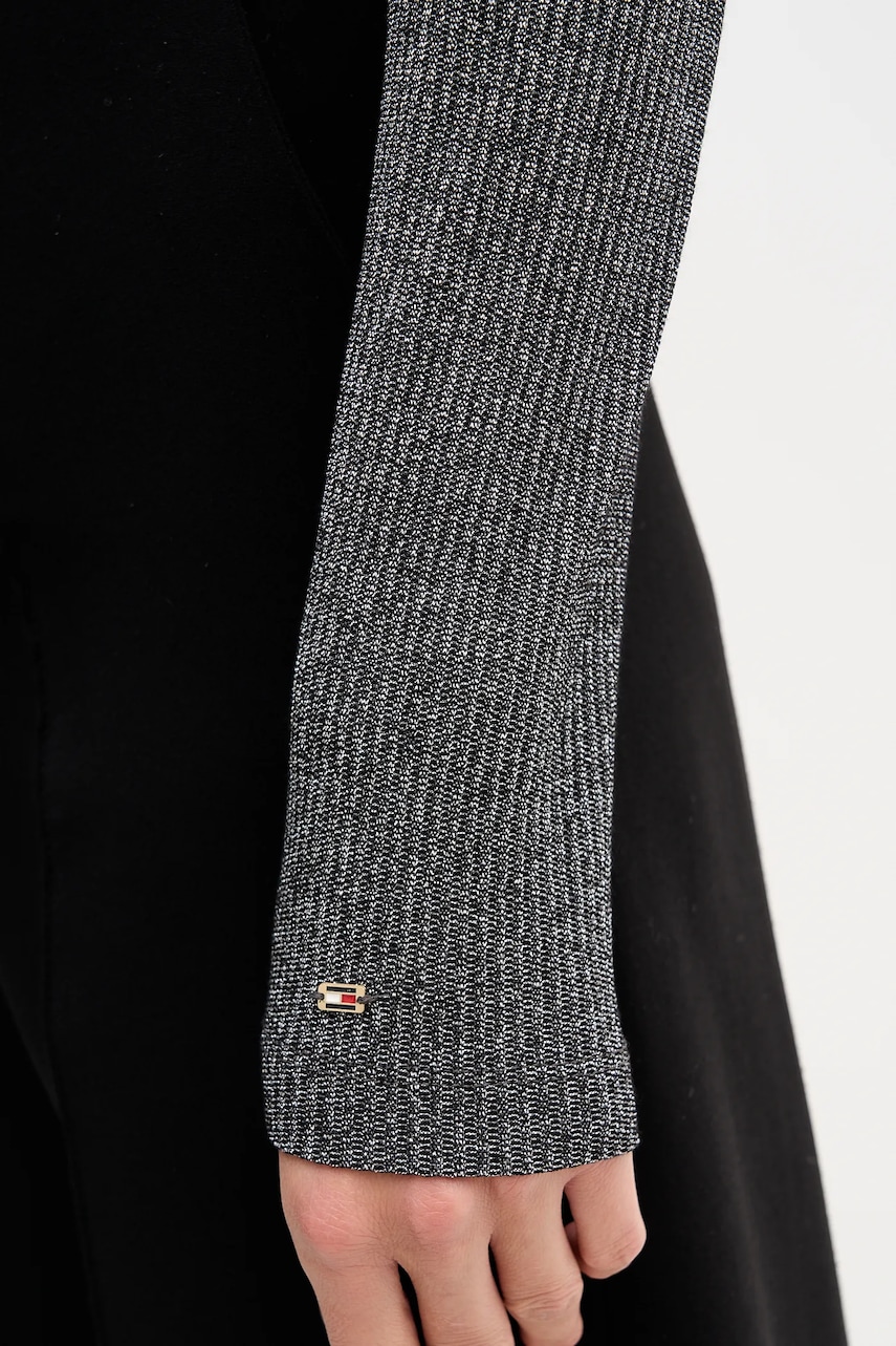 - Dopasowany, podkreślający sylwetkę fason. - Model z półgolfem. - Z tyłu zapięcie na guziki. - Cienka, elastyczna dzianina. - Długość rękawa: 62 cm. - Splot z ozdobną, metaliczną nicią. - Długość: 59 cm. - Szerokość pod pachami: 38 cm. - Wymiary podane dla rozmiaru: S.