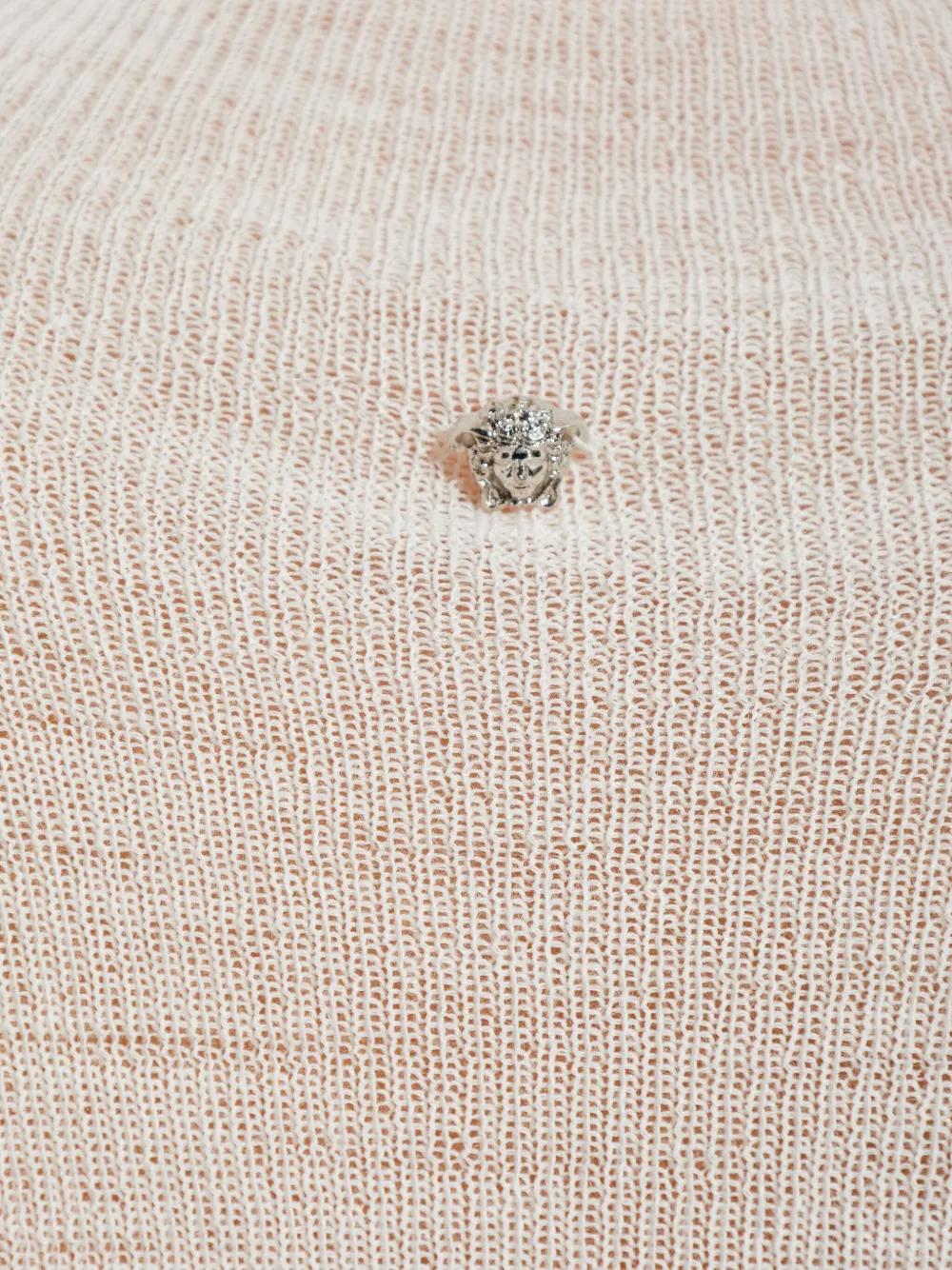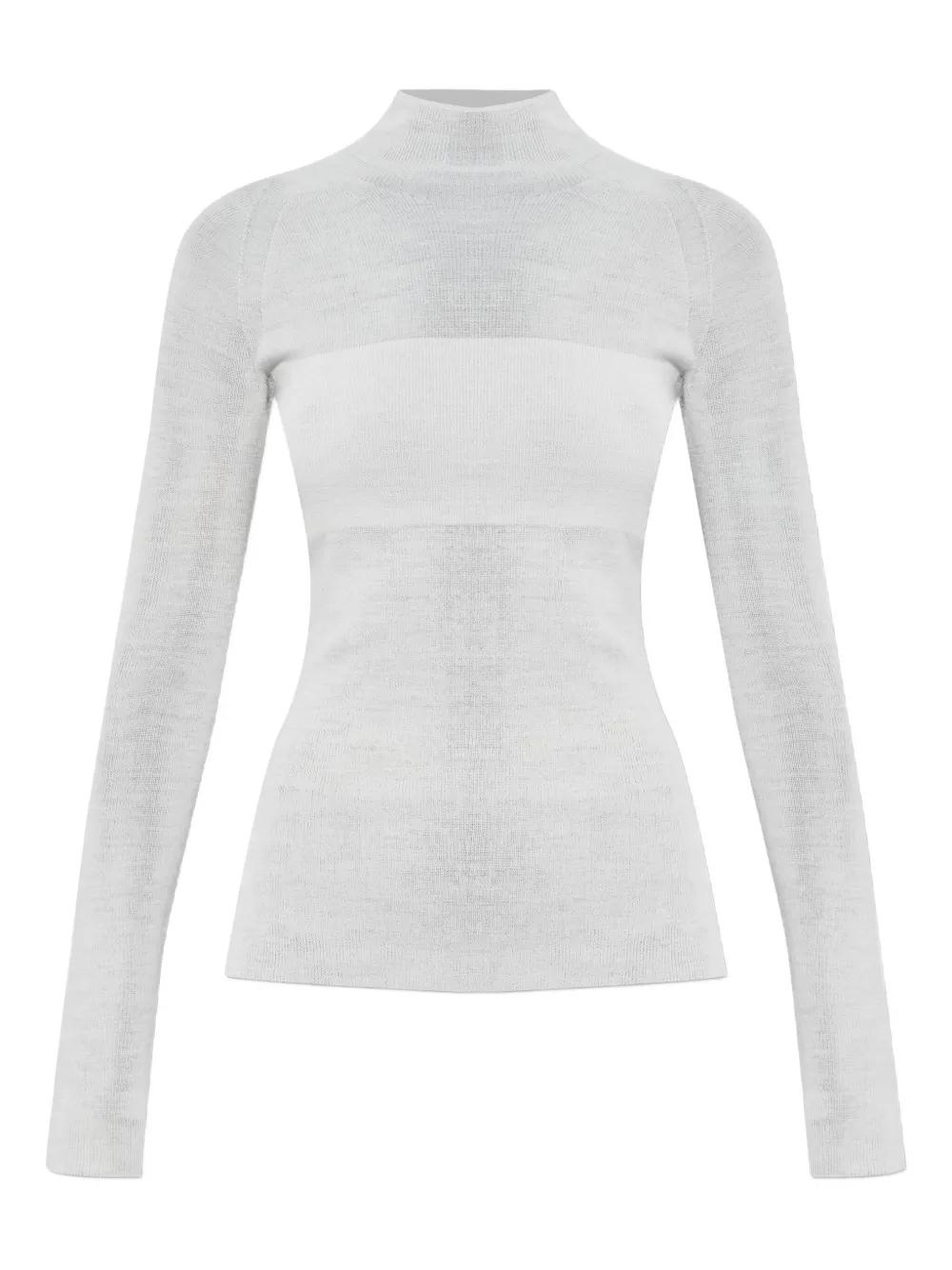 white roll neck long sleeves semi-sheer finish fine knit round logo plaque at the back