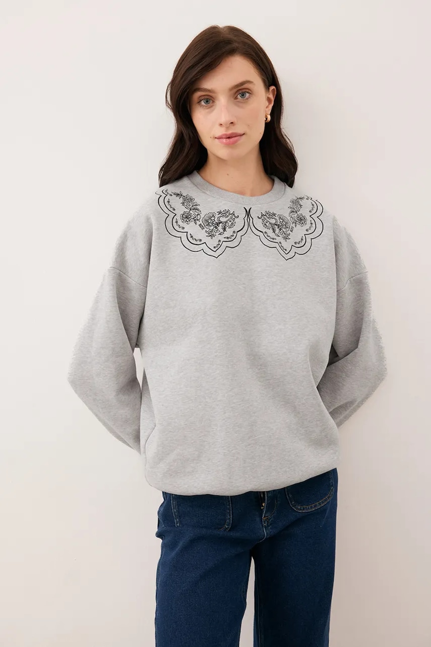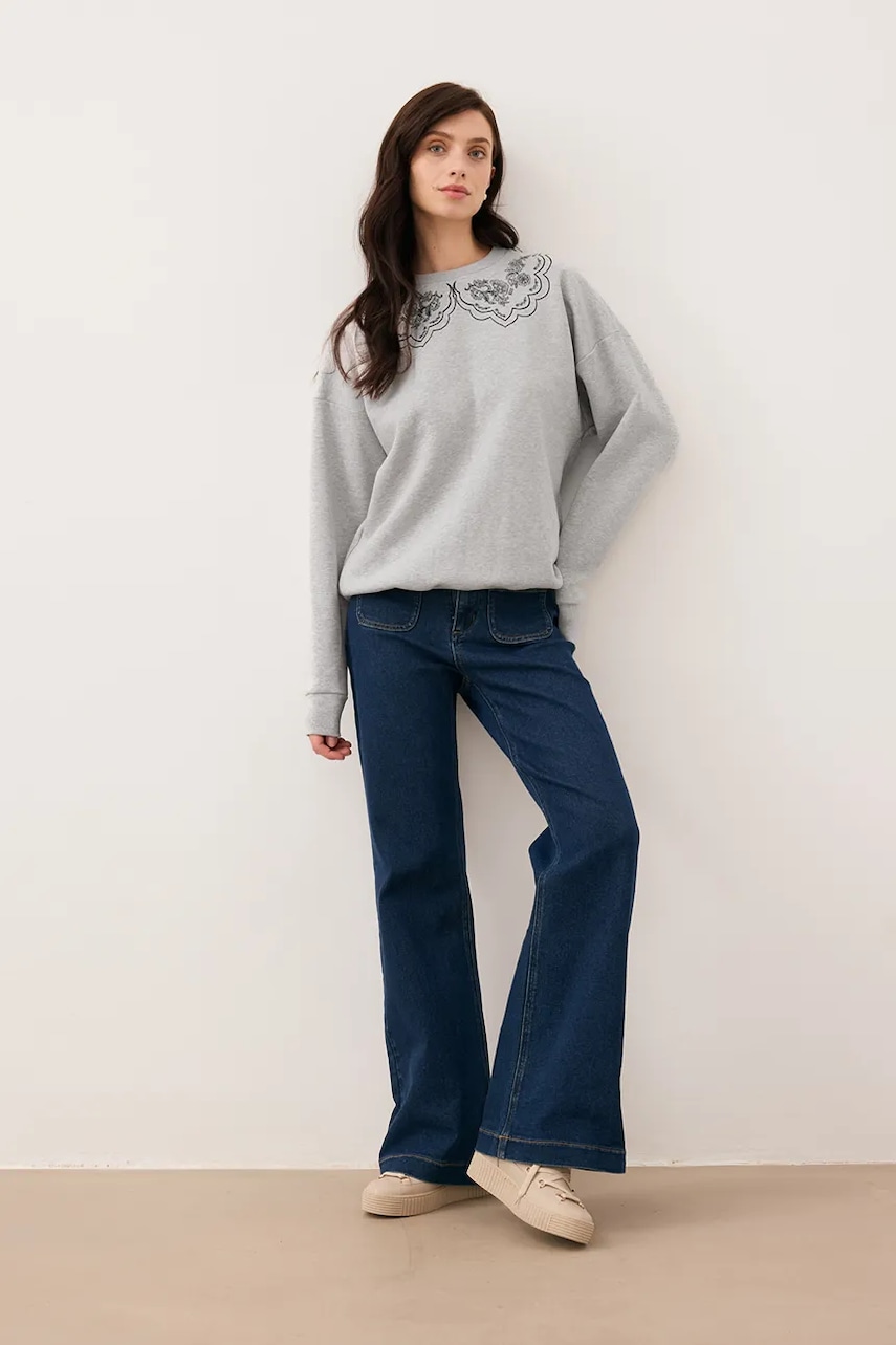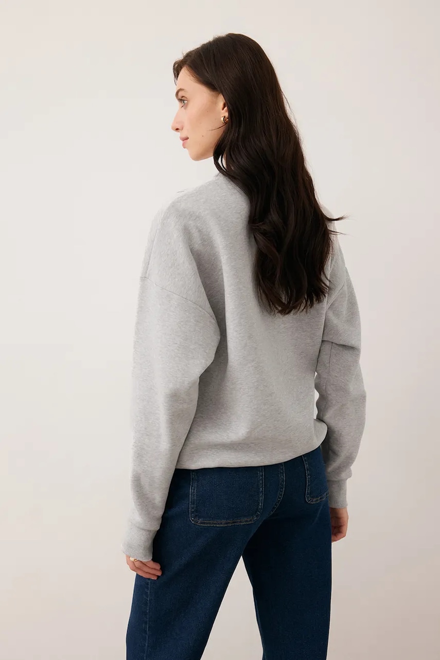 - Prosty, nie blokujący ruchów fason. - Cienka, lekko elastyczna dzianina. - Klasyczny, okrągły dekolt. - Ozdobne detale. - Długi rękaw.
