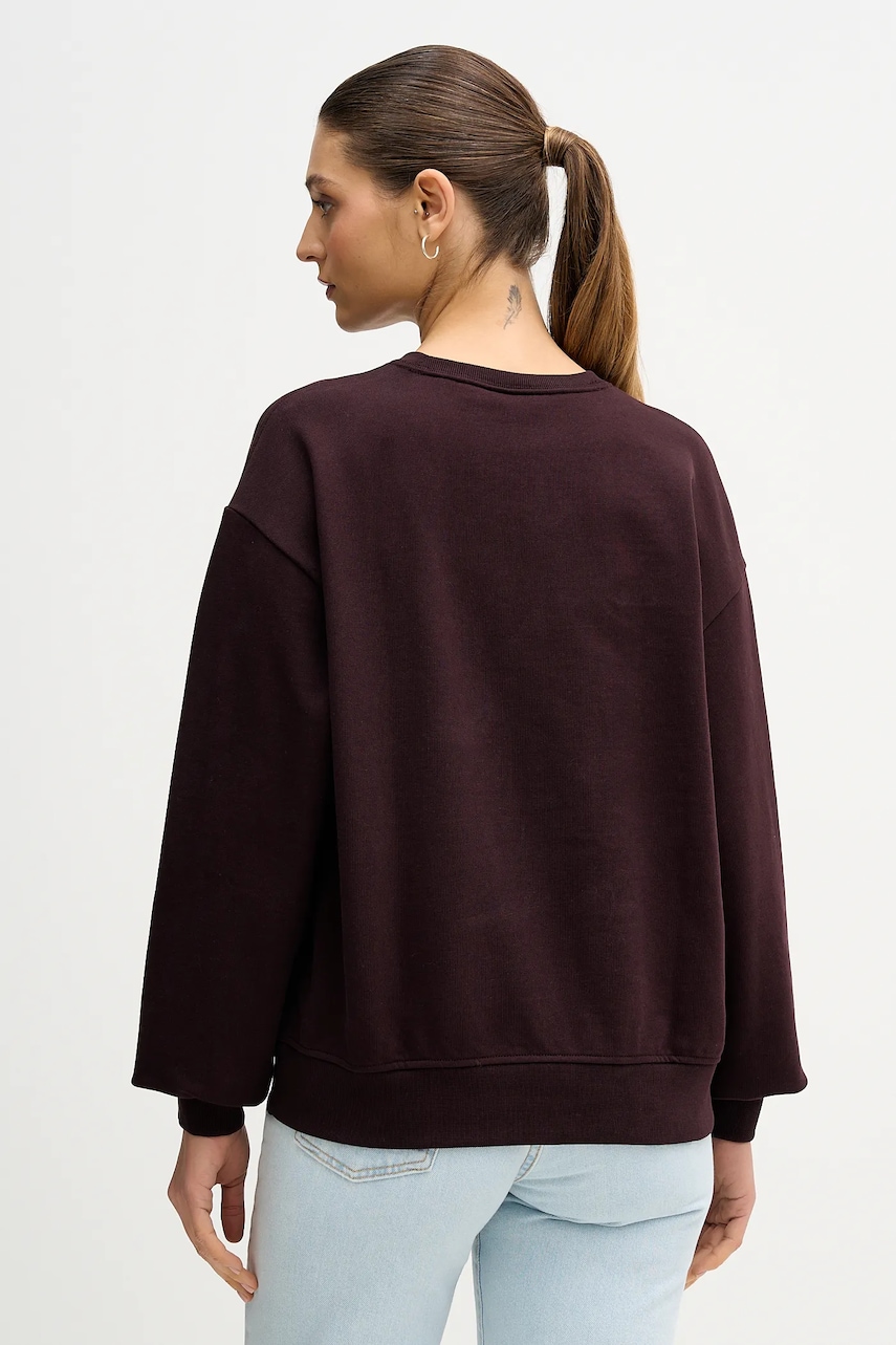 - Luźny krój zapewniający pełną swobodę ruchów. - Długi rękaw. - Krój rękawa z obniżoną linią ramion nie ogranicza mobilności. - Klasyczny, okrągły dekolt. - Rękawy i dolna krawędź wykończona wygodnym, elastycznym ściągaczem. - Model z ozdobną aplikacją i nadrukiem. - Długość: 61 cm. - Szerokość pod pachami: 55 cm. - Wymiary podane dla rozmiaru: S.