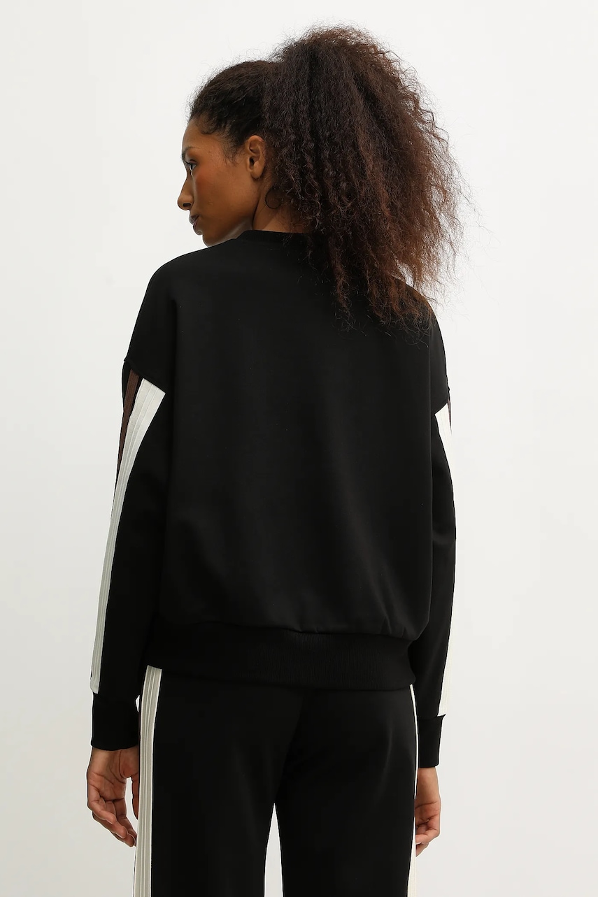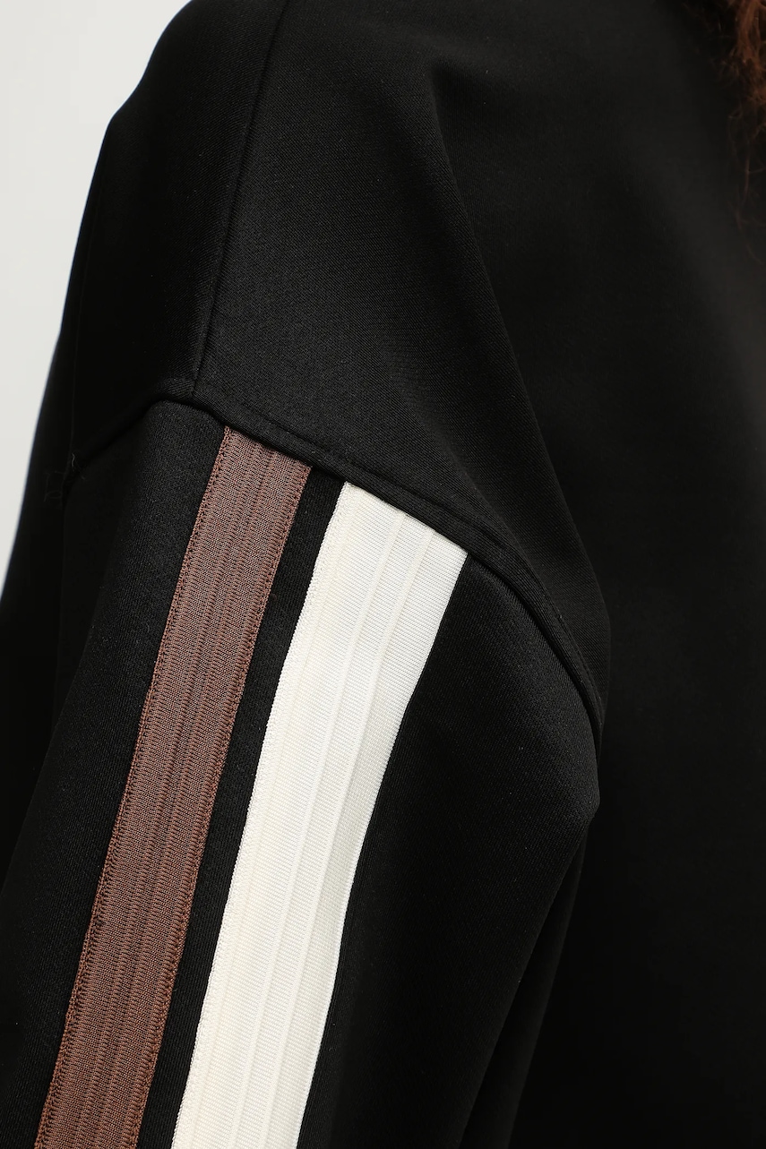 - Zawiera plastik pochodzący z recyklingu. - Fason oversize. - Klasyczny, okrągły dekolt. - Model z lampasami. - Cienka, elastyczna dzianina. - Miękko wyściełany model. - Długość rękawa(mierzona od dekoltu): 77 cm. - Długość: 54 cm. - Szerokość pod pachami: 67 cm. - Wymiary podane dla rozmiaru: S.
