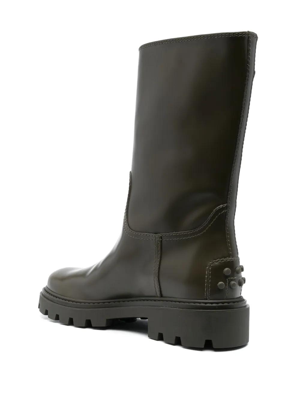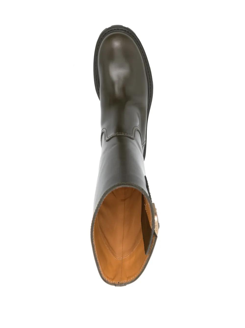 green calf leather smooth grain decorative buckle detail branded insole round toe slip-on style low block heel rubber sole