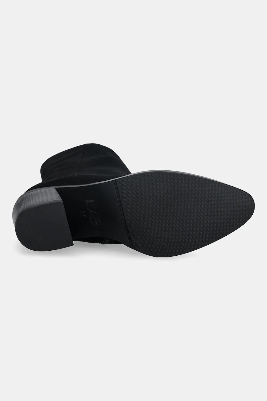 - Spiczasty, usztywniony nosek. - Model na obcasie typu słupek. - Wygodne zapięcie na suwak ułatwia zakładanie i zdejmowanie. - Usztywniony zapiętek stabilizuje piętę i utrzymuje stopę w bucie, tak aby nie wysuwała się podczas ruchu. - Wysokość obcasa: 7 cm. - Długość wkładki wynosi: 25 cm. - Wymiary podane dla rozmiaru: 37.