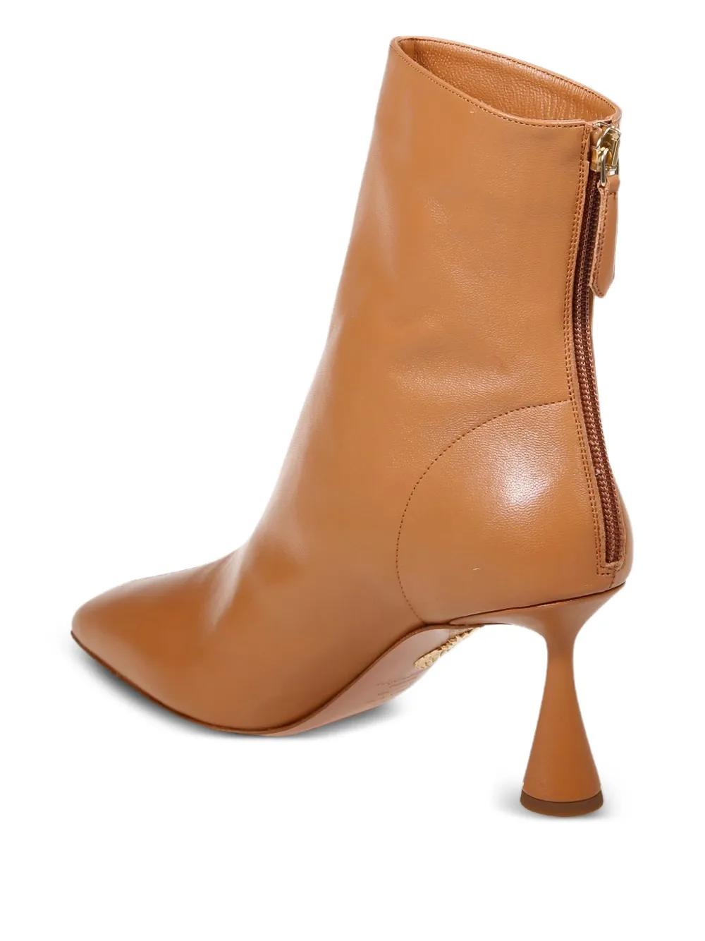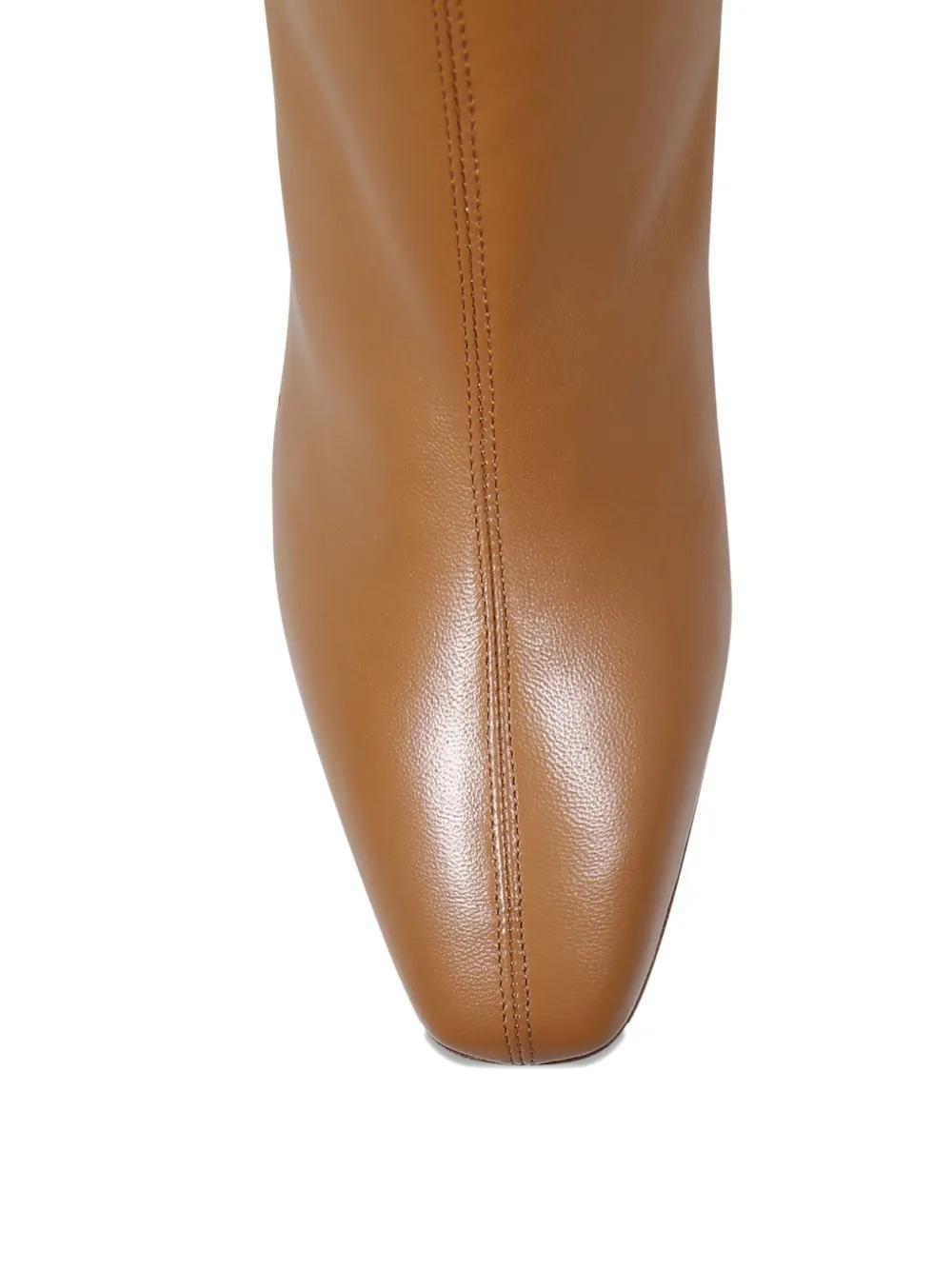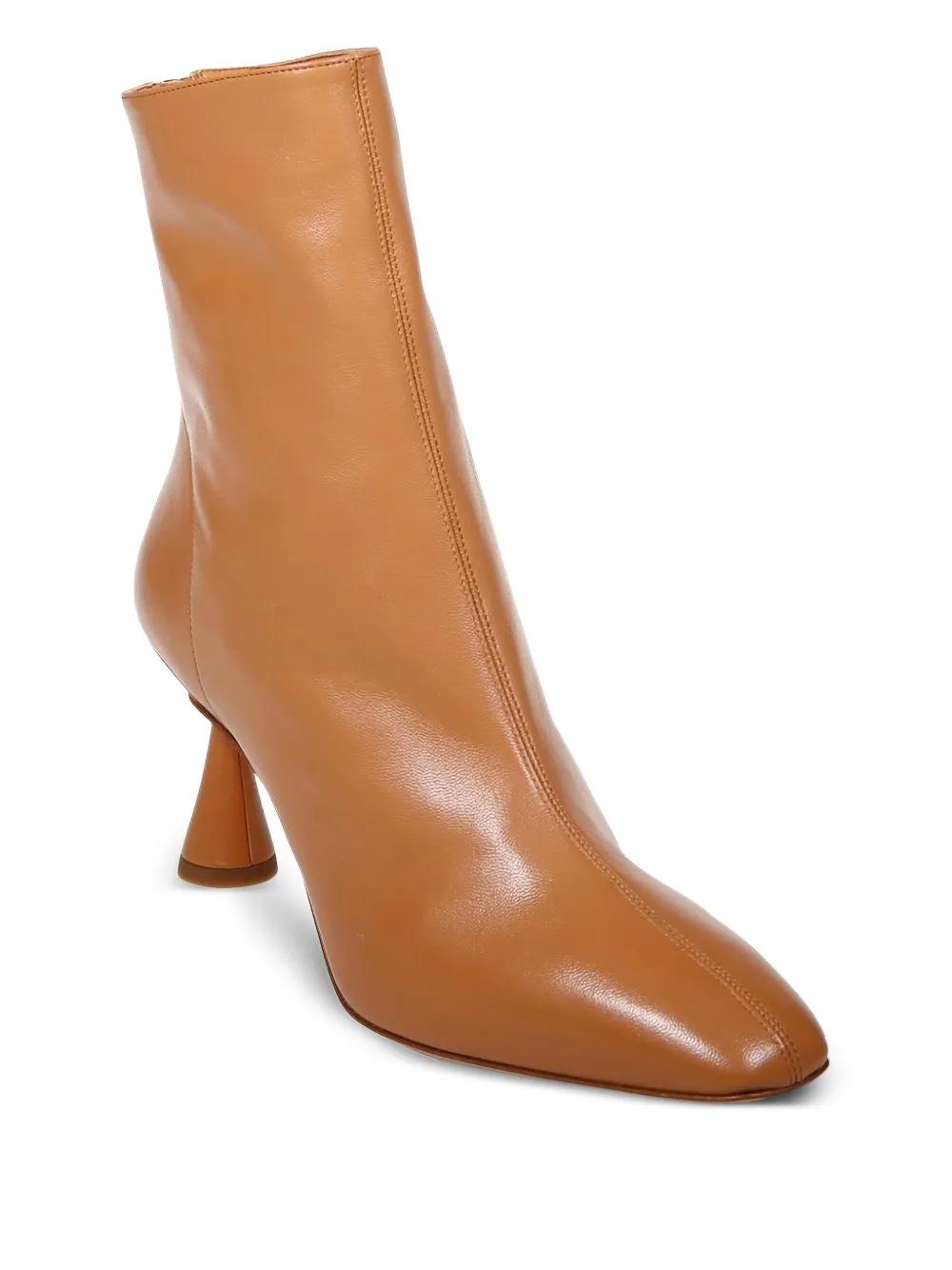 light caramel leather upper square toe sculpted heel rear zip fastening ankle height