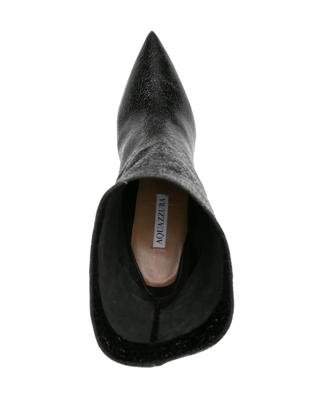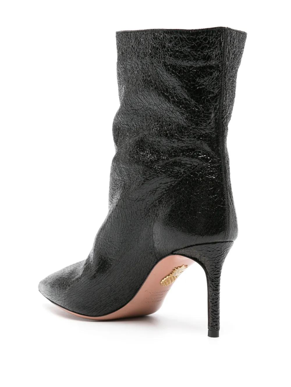 black lambskin crinkled finish ankle-length ruched detailing pointed toe branded leather insole leather outsole 75mm stiletto heel