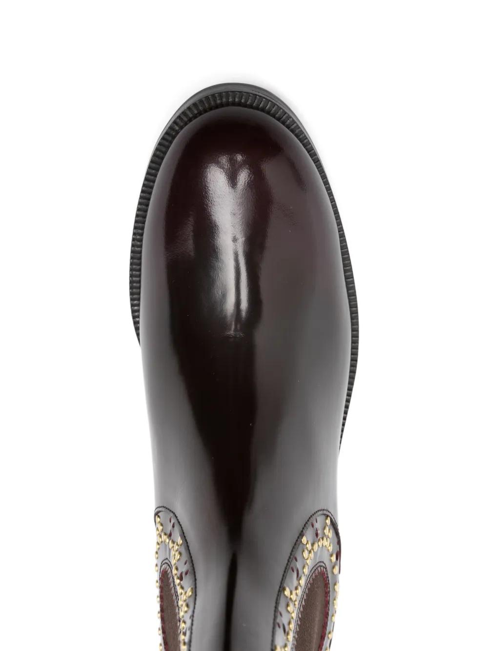 brown studded detailing pull-tab at the opening elasticated side panels leather outer low heel