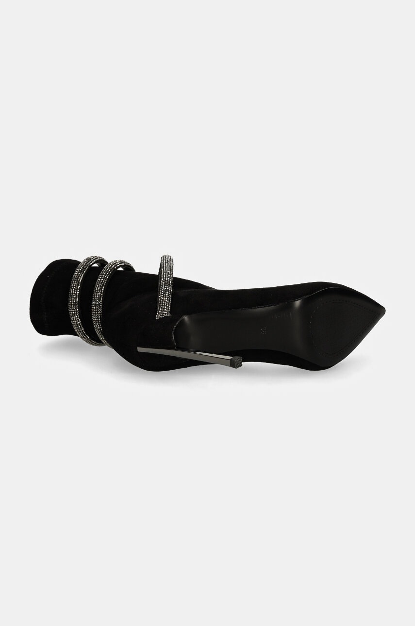 - Spiczasty, usztywniony nosek. - Usztywniony zapiętek zapewnia doskonałe wsparcie kostki i pięty. - Lekko ocieplony model. - Model na obcasie typu szpilka. - Gumowa podeszwa zewnętrzna jest wytrzymała i odporna na uszkodzenia. - Ozdobny detal. - Wysokość obcasa: 10,5 cm. - Długość wkładki wynosi: 25 cm. - Wymiary podane dla rozmiaru: 38.
