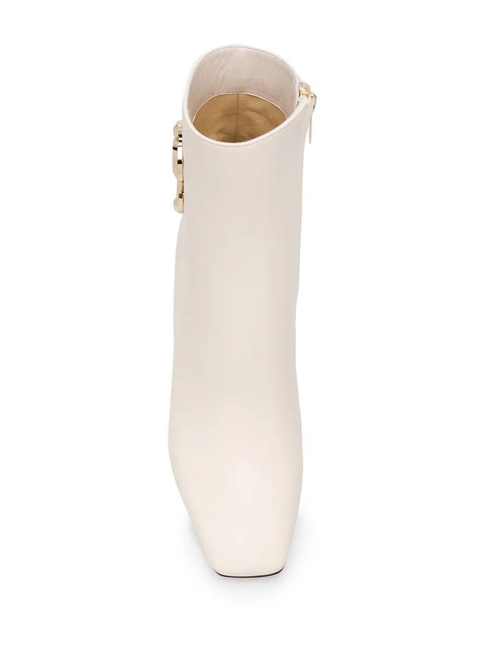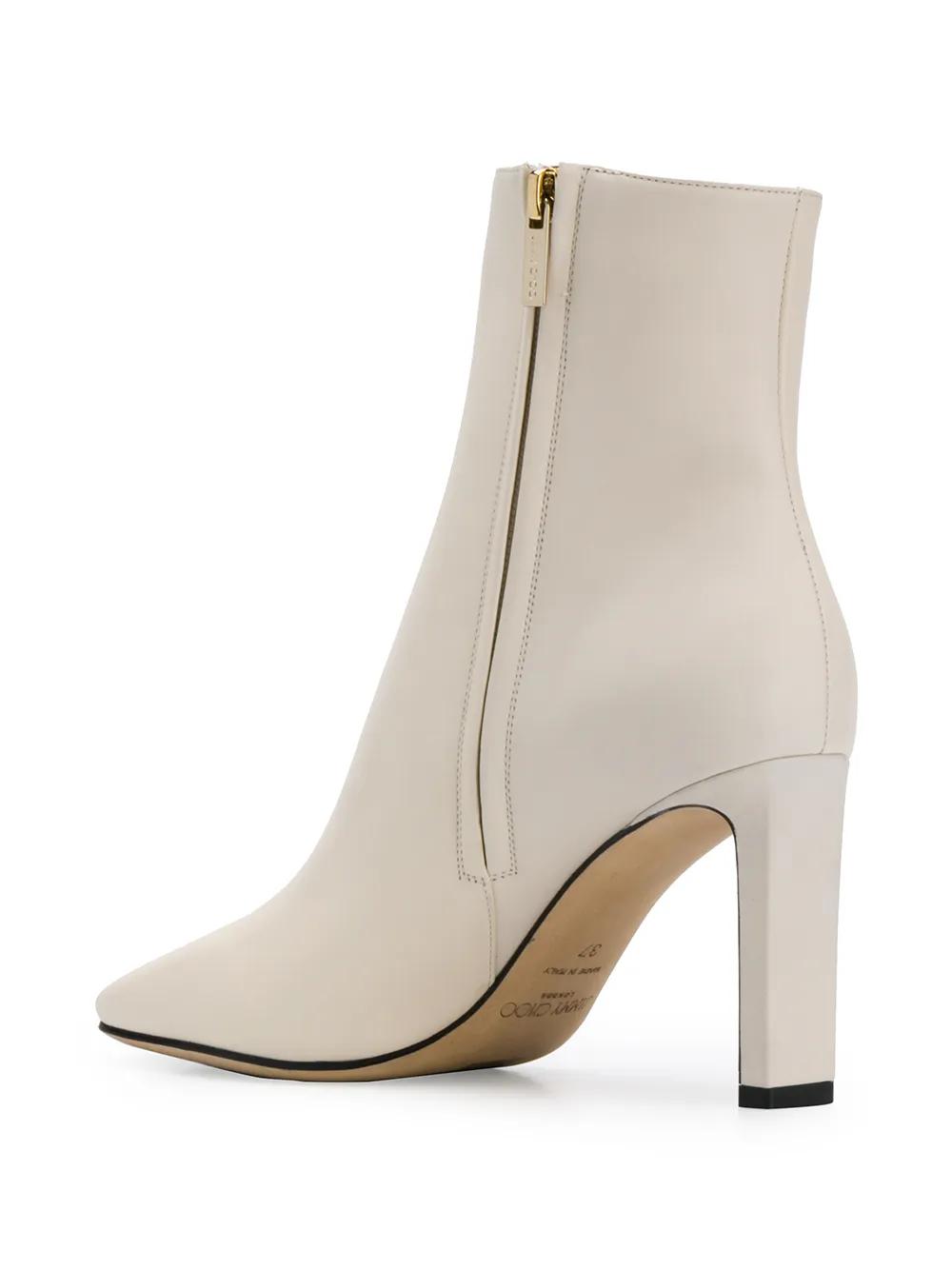 Embrace all things dazzling with Jimmy Choo’s latest collection. From star jewels to crystal appliqué detailing, you are sure to add a touch of timeless glamour to every outfit with the brand’s latest offerings for the new season. These latte white leather logo plaque booties from Jimmy Choo feature a pointed toe, a leather insole, a mid high stiletto heel, a gold-tone logo plaque and an ankle length.