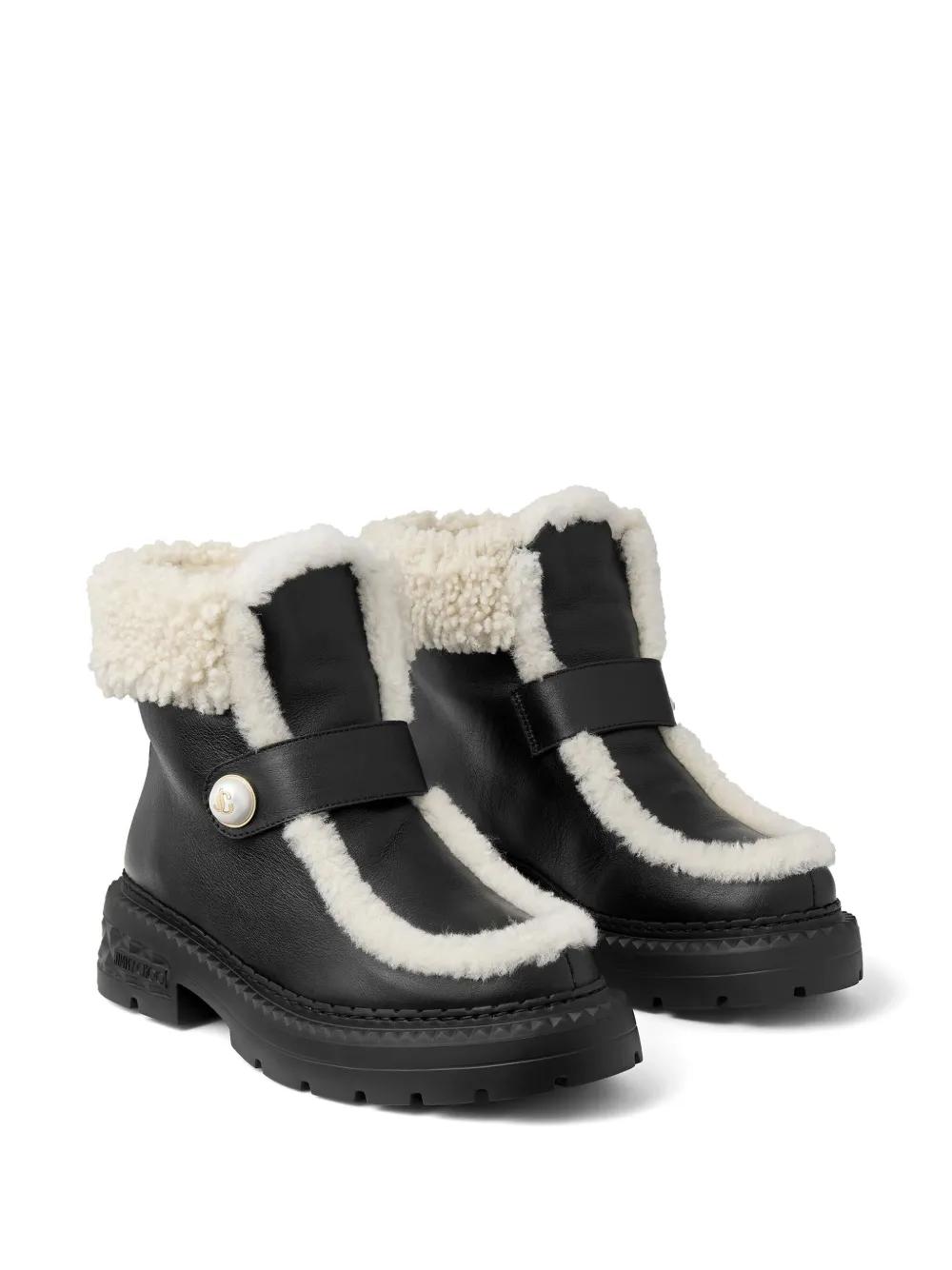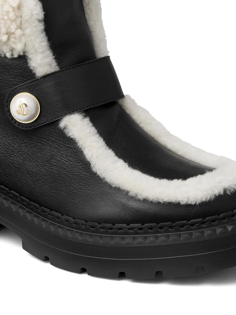 black calf leather/sheepskin shearling side press-stud fastening round toe branded insole ridged rubber sole