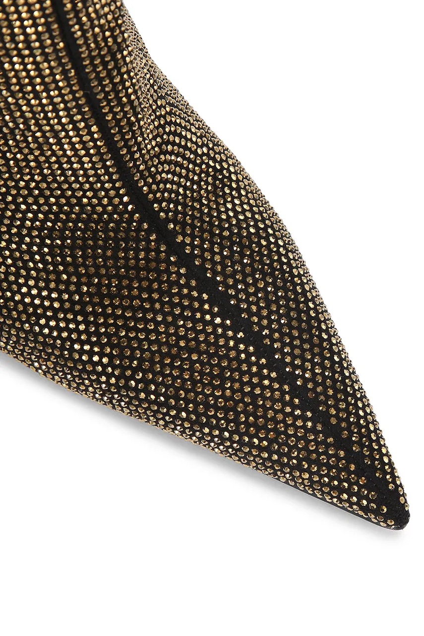 - Spiczasty, lekko usztywniony nosek. - Usztywniony zapiętek stabilizuje piętę i utrzymuje stopę w bucie, tak aby nie wysuwała się podczas ruchu. - Tekstylne wnętrze jest komfortowe dla stopy i ułatwia utrzymanie obuwia w czystości. - Model na obcasie typu szpilka. - Model z dżetami.