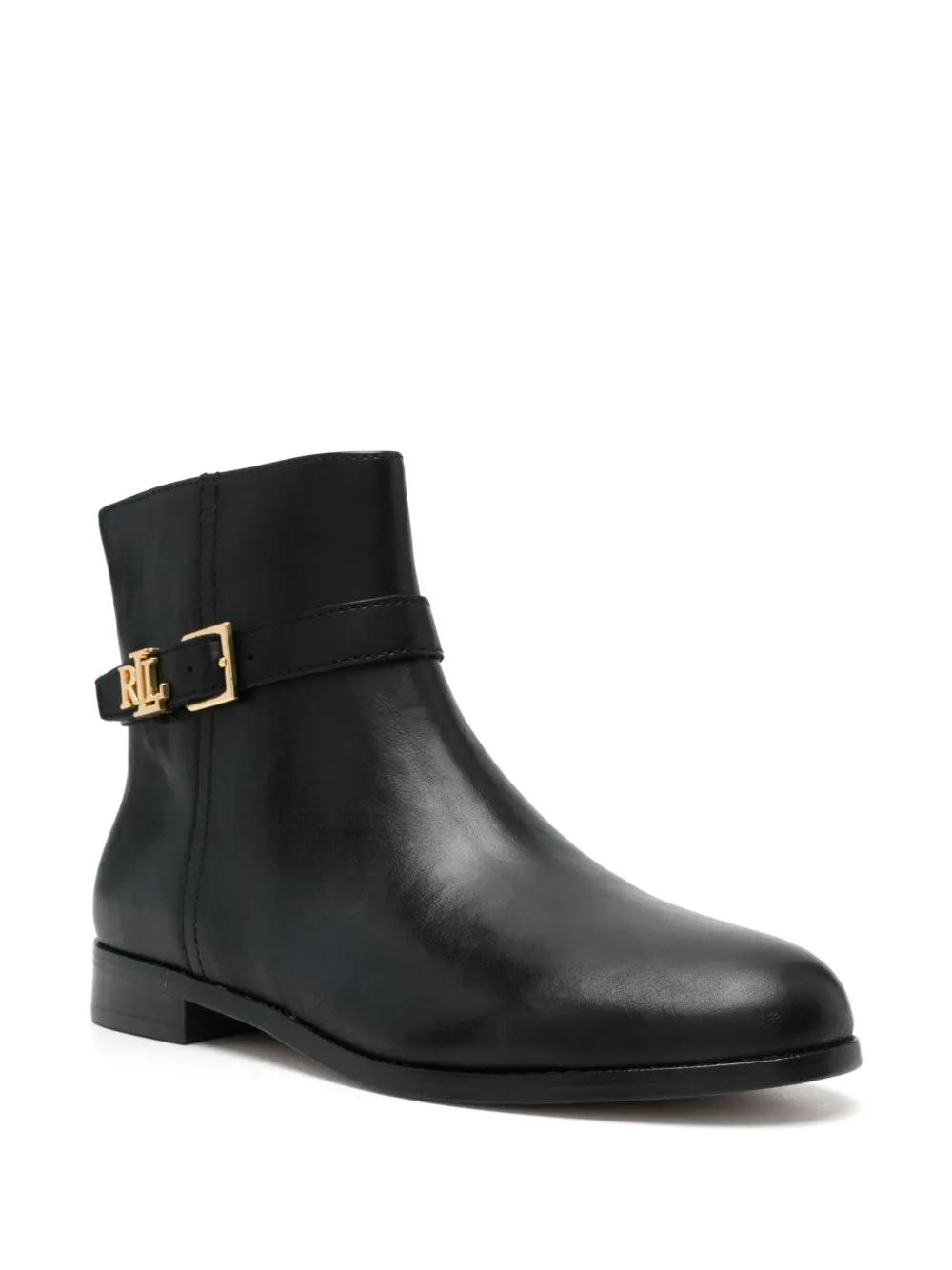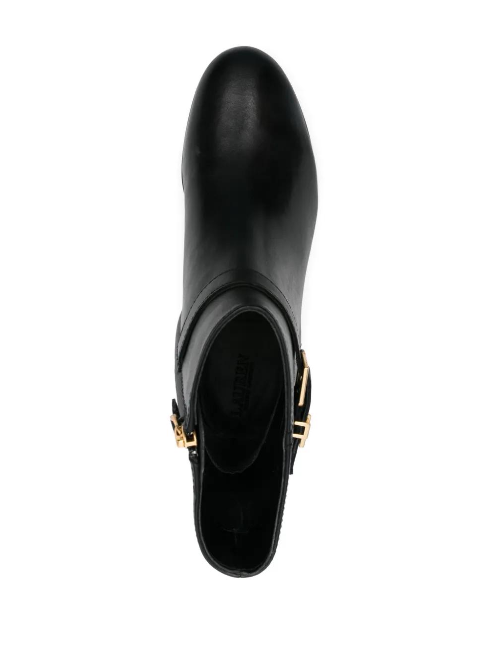 black calf leather side zip fastening decorative buckle detail gold-tone logo plaque ankle-length almond toe branded insole leather lining leather sole
