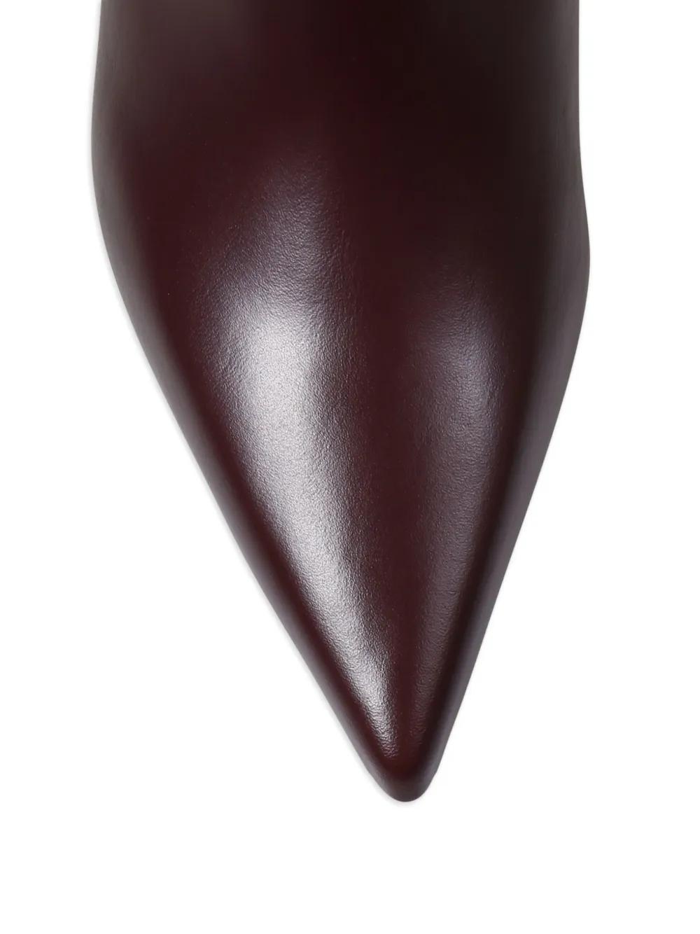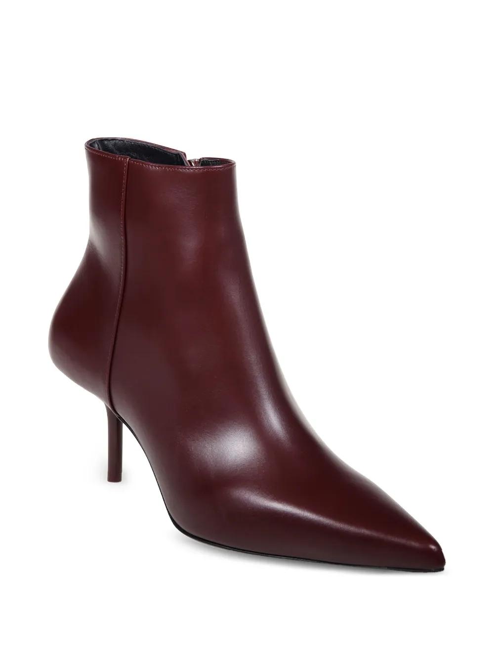 burgundy leather upper pointed toe stiletto heel zip fastening ankle height