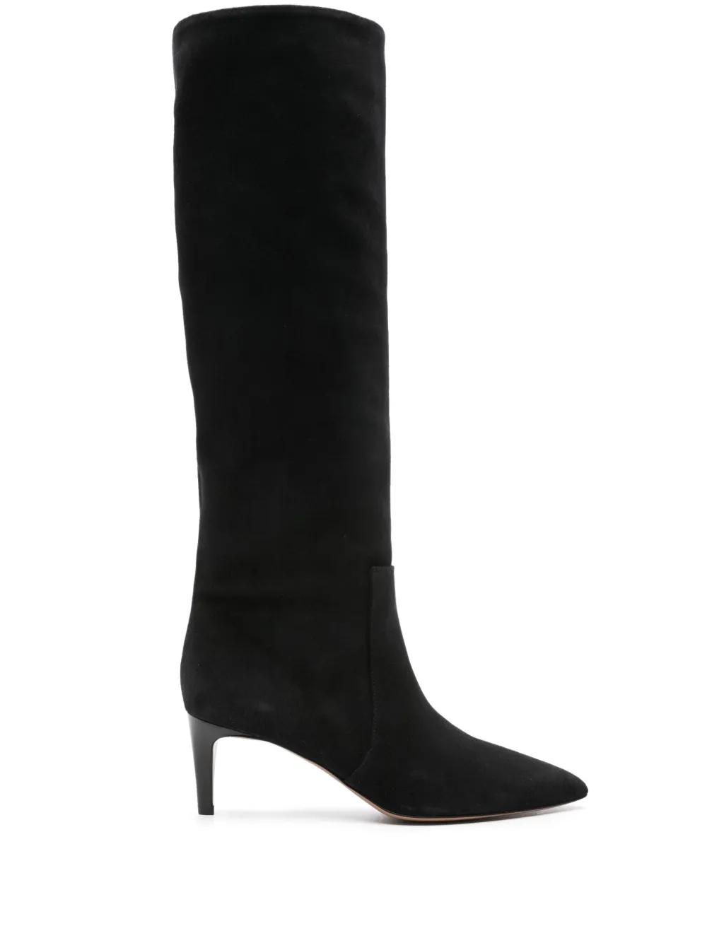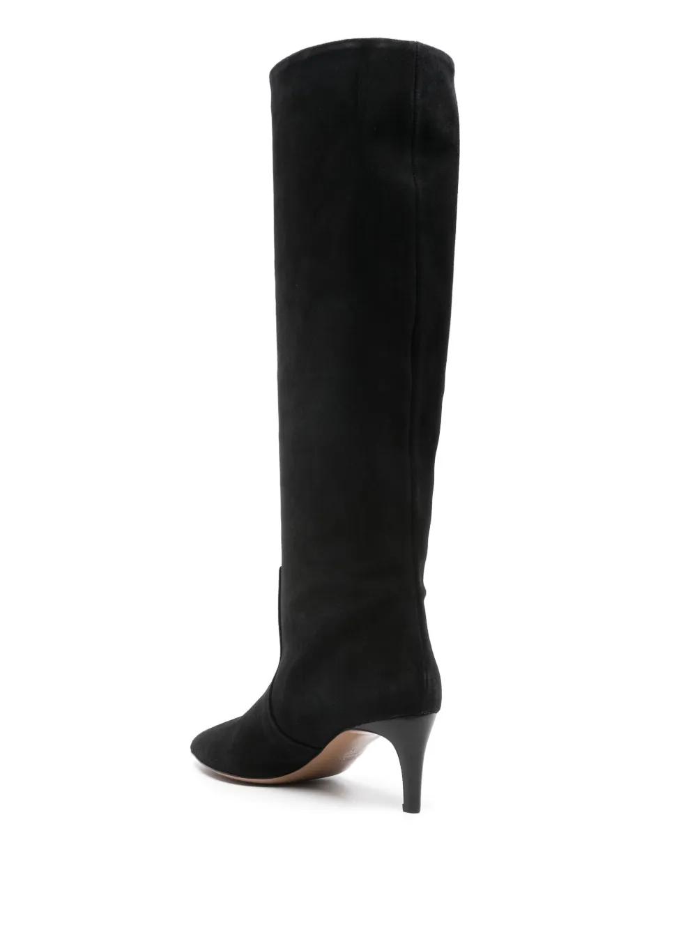 black calf suede panelled design pointed toe below-knee length slip-on style 60mm stiletto heel branded leather insole leather lining
