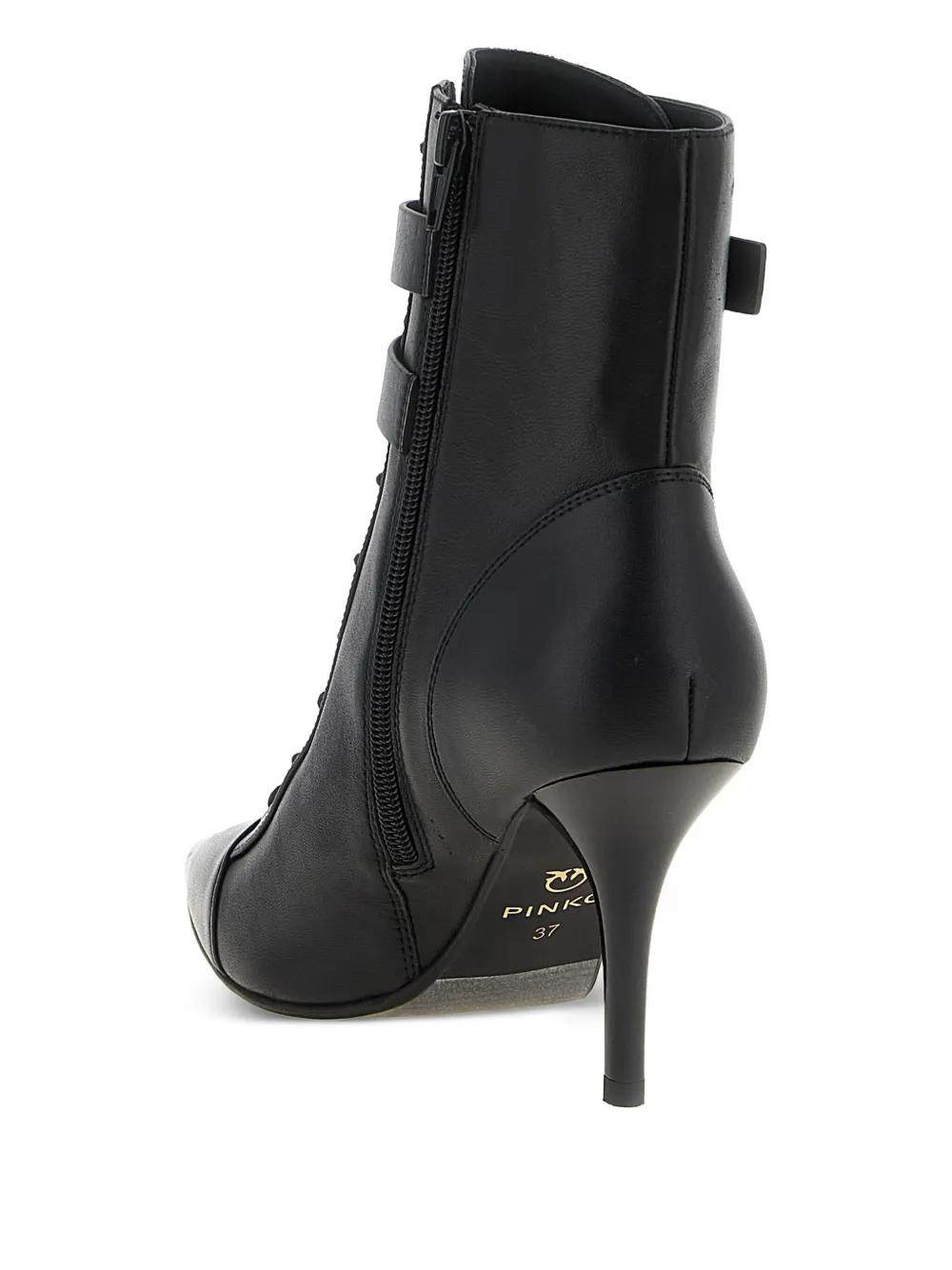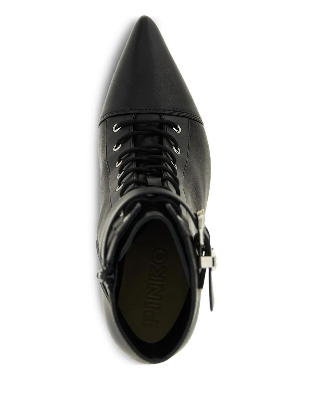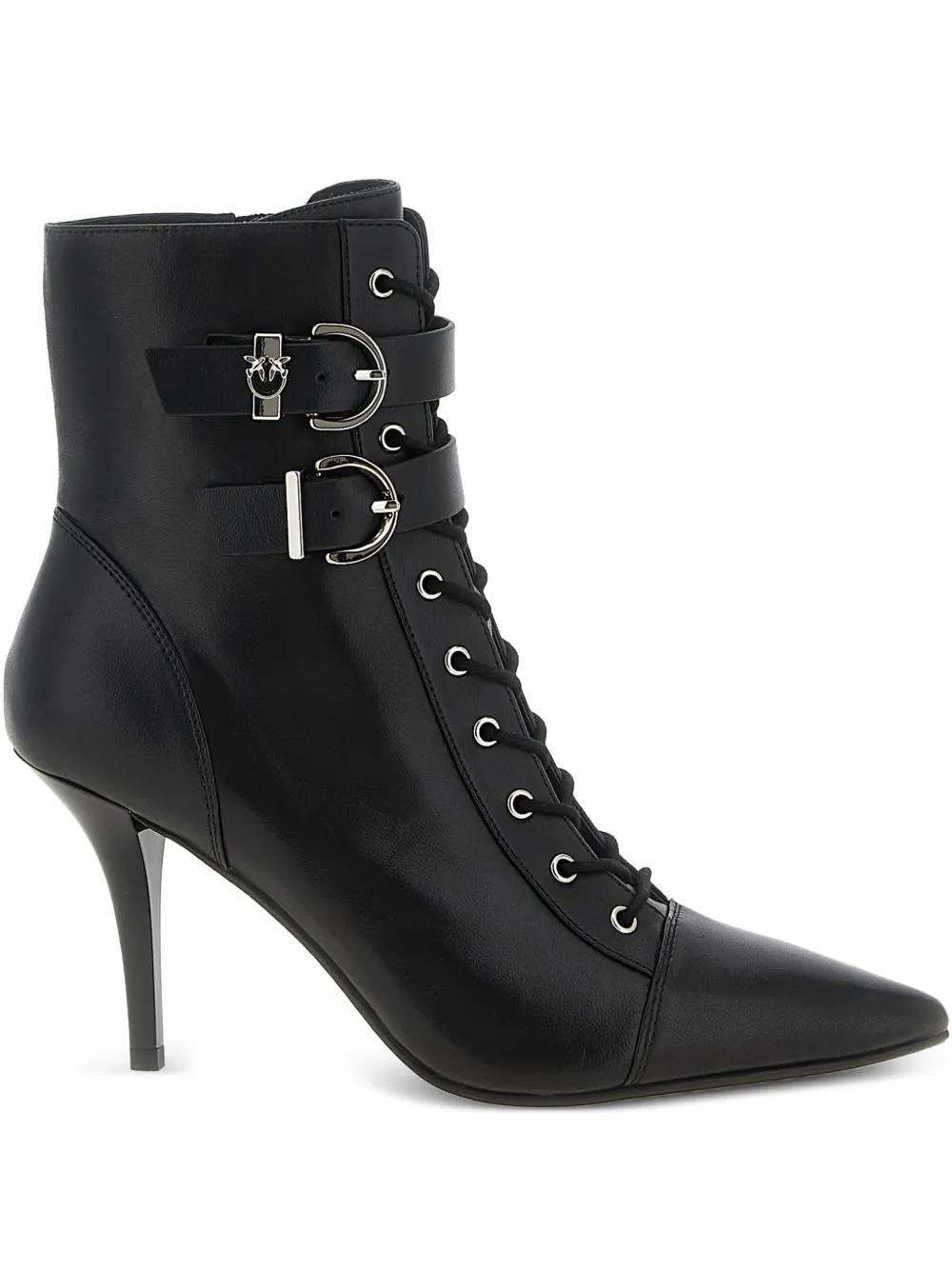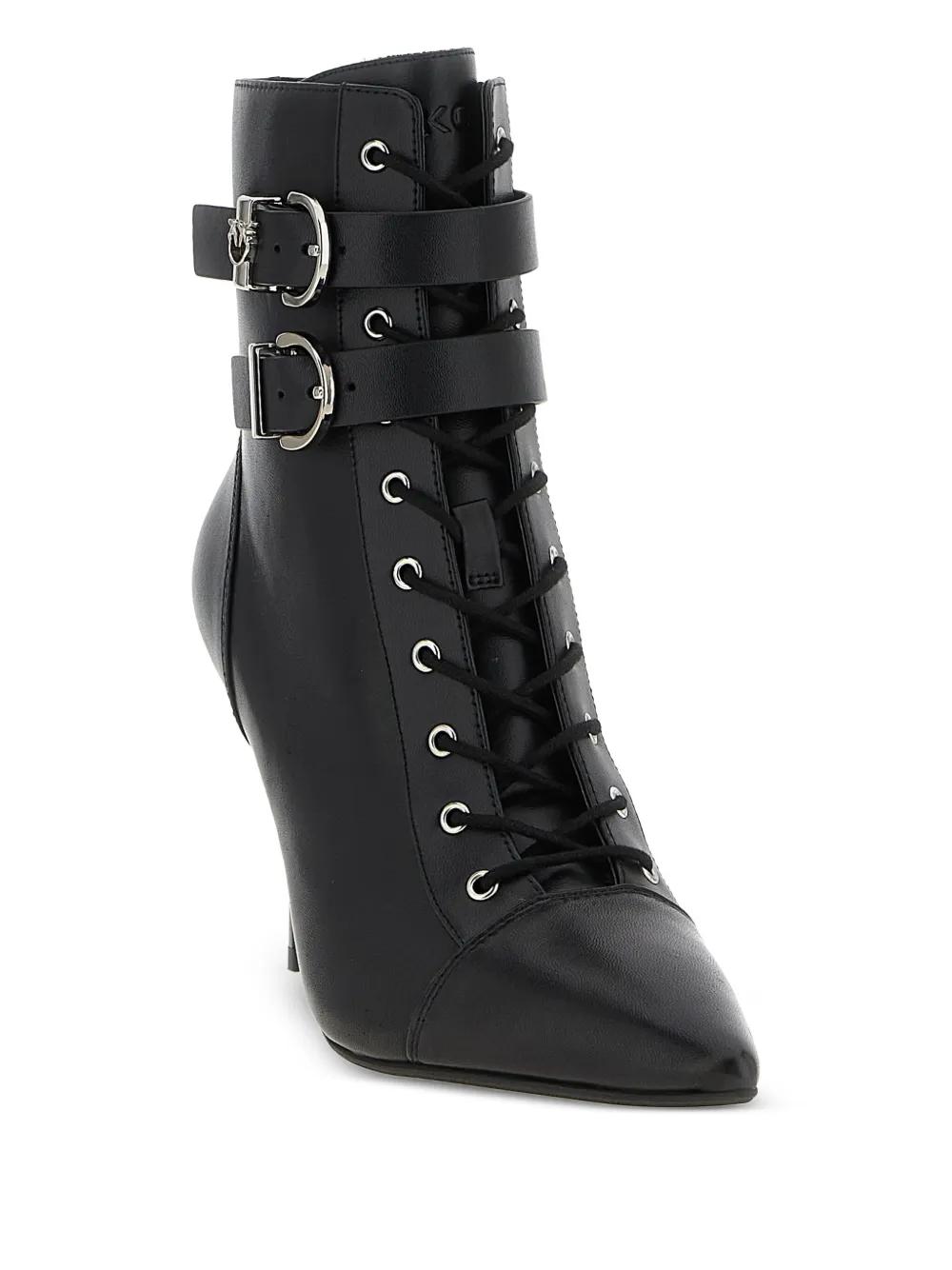 black pointed toe lace-up fastening buckle ankle straps leather upper stiletto heel