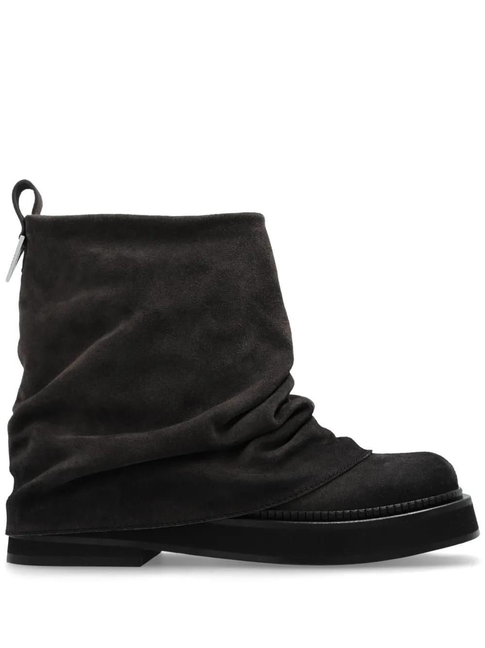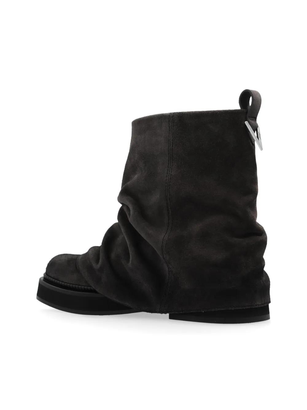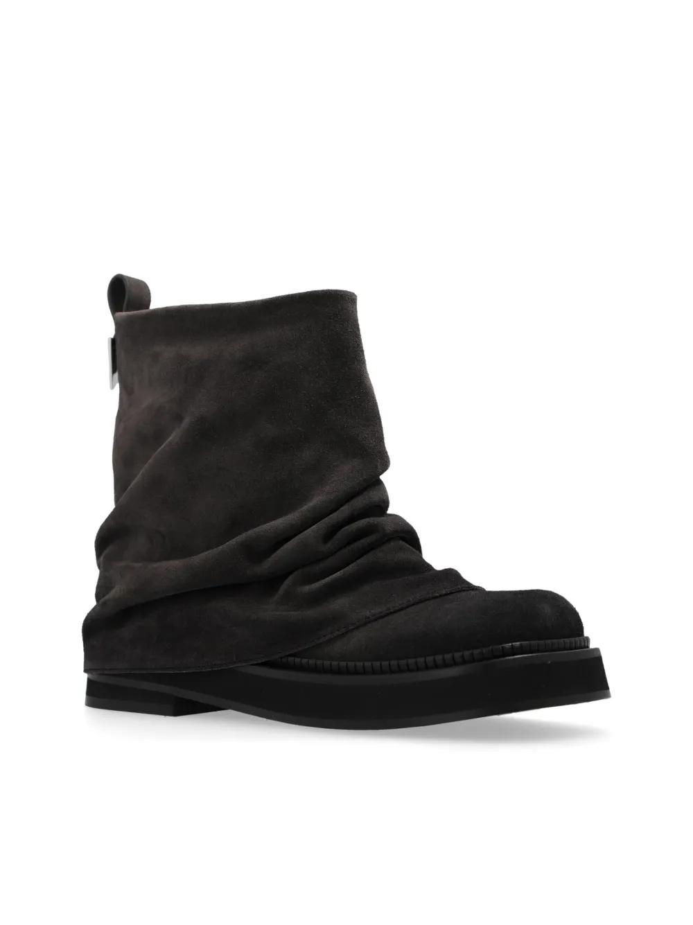 taupe grey leather ruched detailing pull-tab at the heel silver-tone logo plaque round toe slip-on style ankle-length low heel