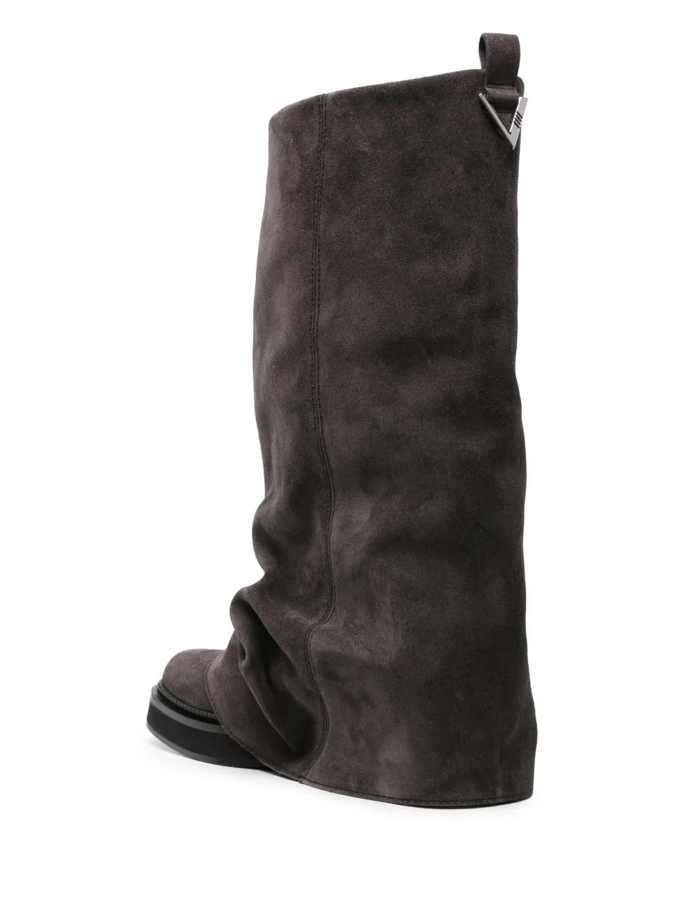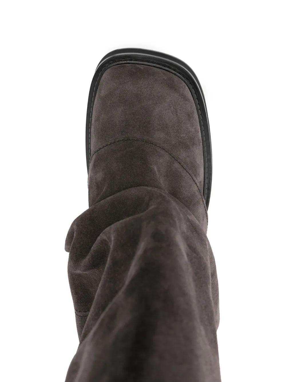 taupe grey calf suede silver-tone logo plaque square toe slip-on style pull-tab at the heel leather outsole