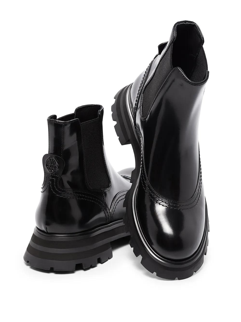 black leather tonal stitching logo pull-tab at the heel round toe elasticated side panels ankle-length chunky rubber lug sole