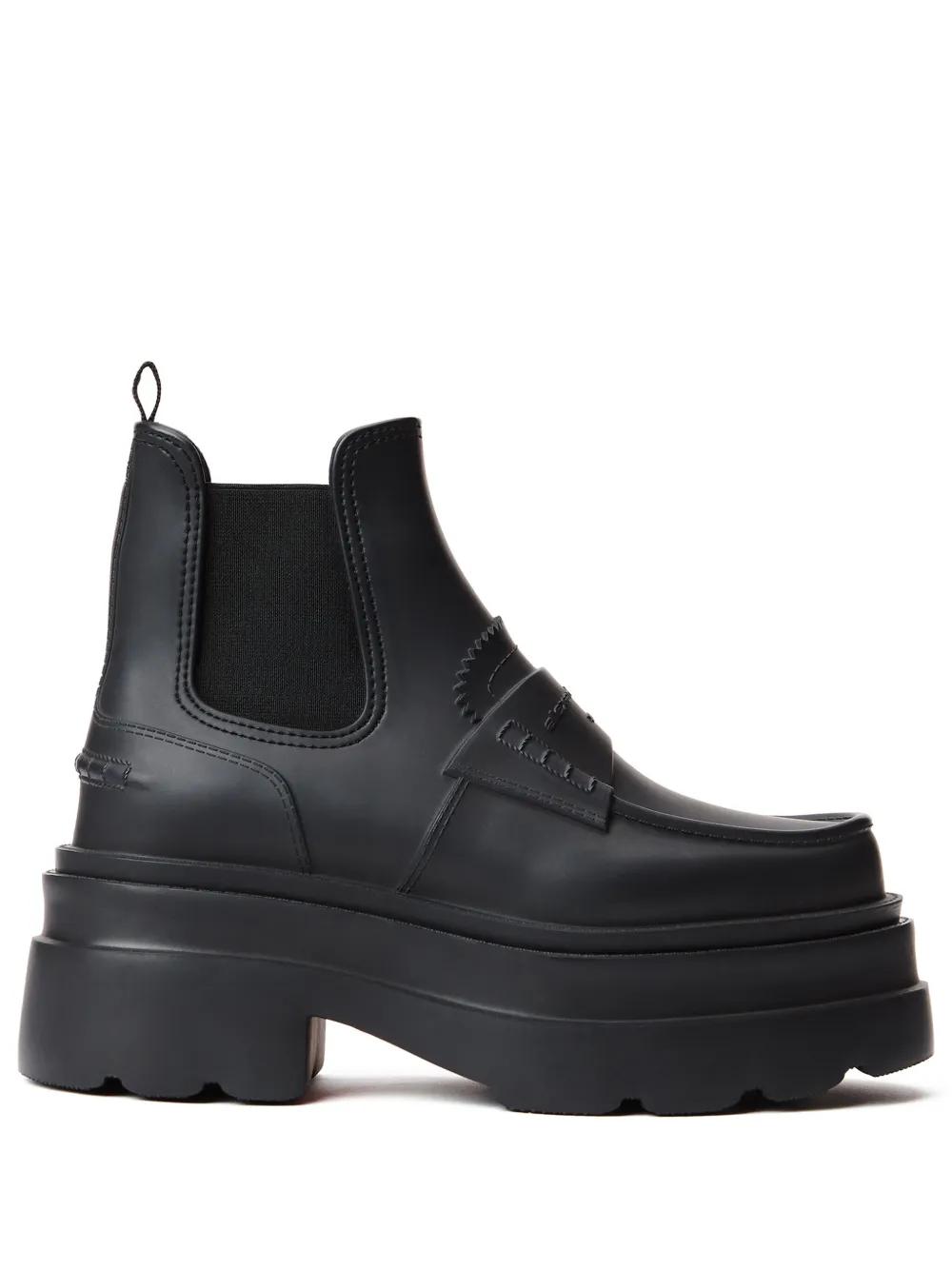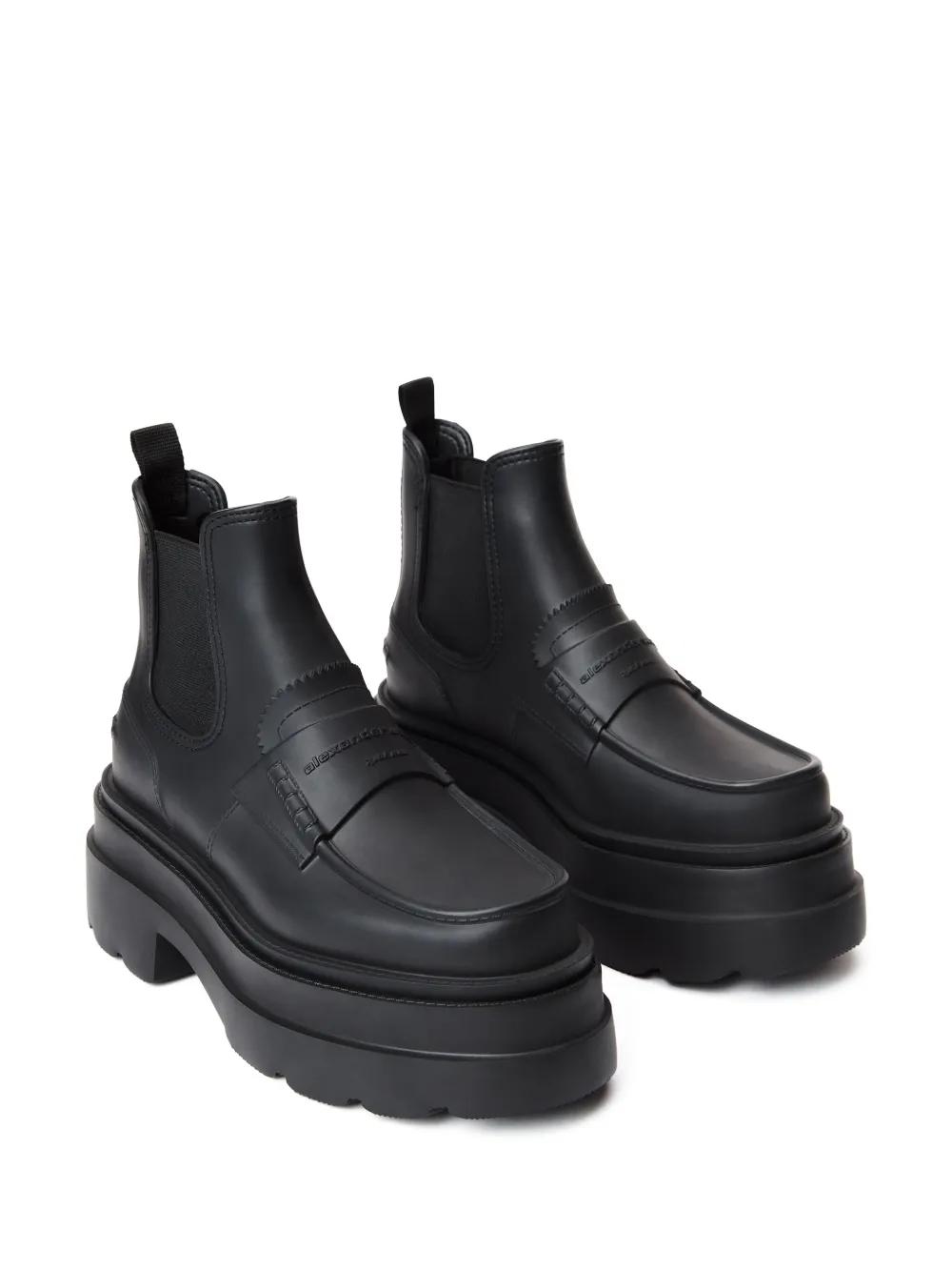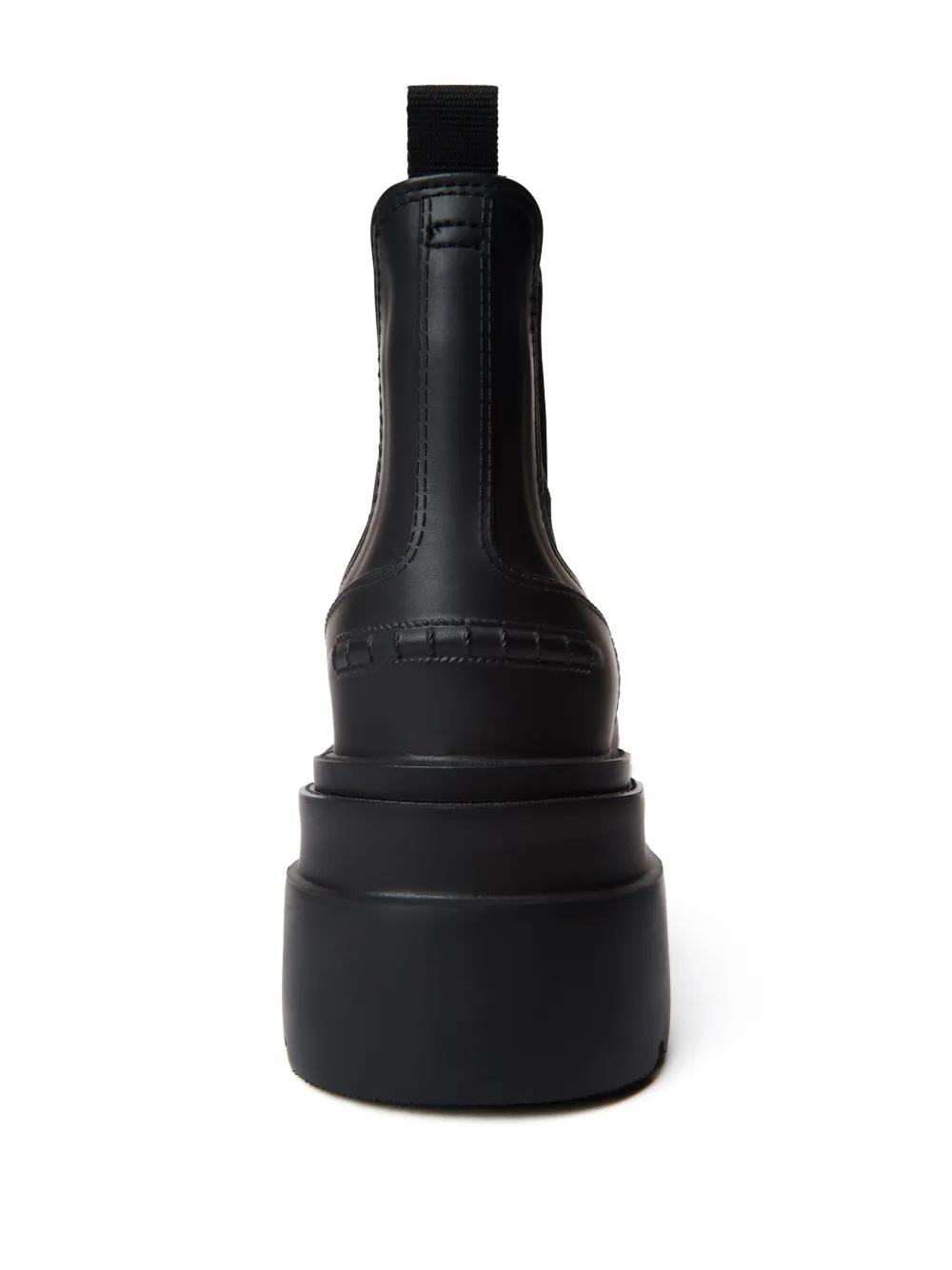 black calf leather panelled design debossed logo to the front round toe elasticated side panels pull-tab at the heel ankle-length platform sole ridged rubber sole
