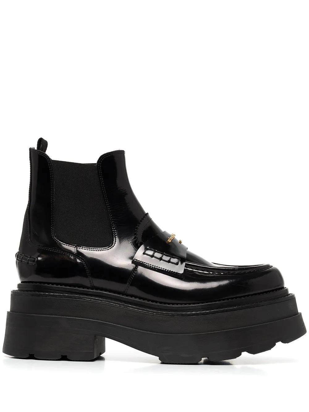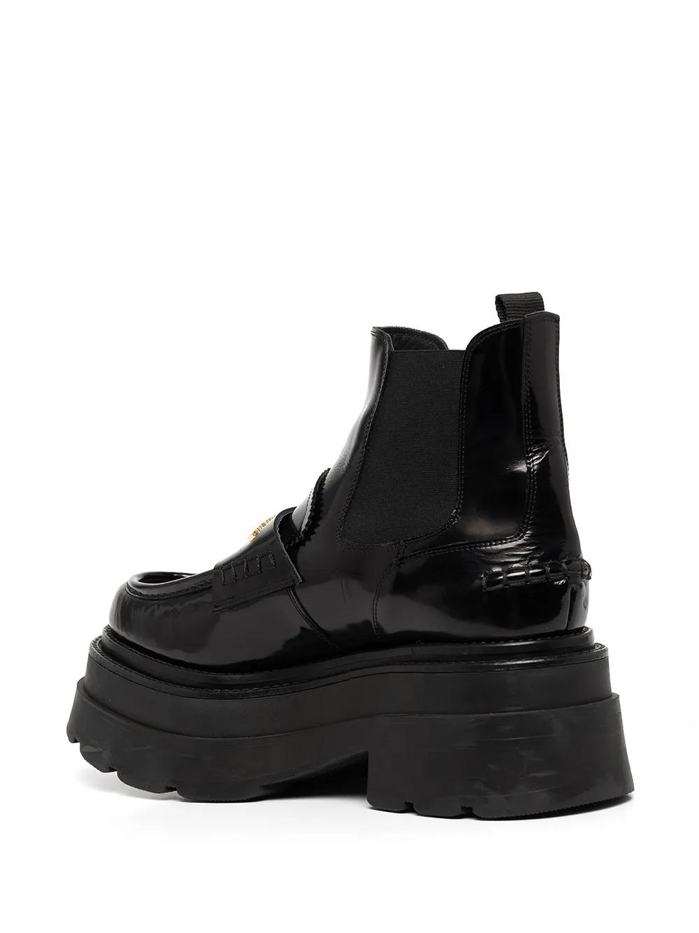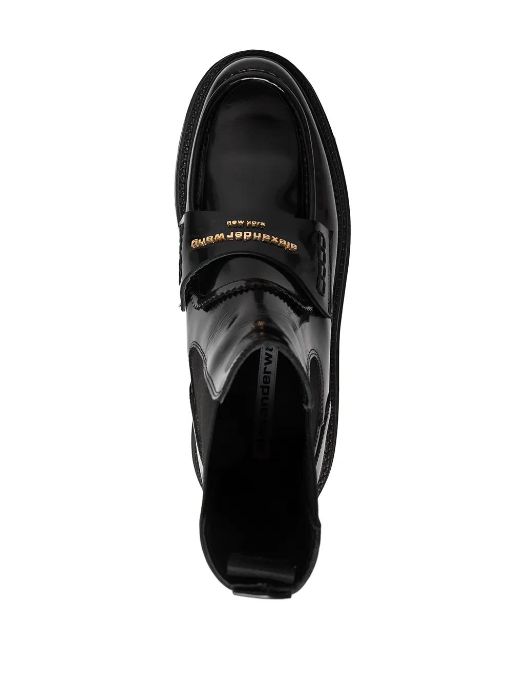 black calf leather high-shine finish gold-tone logo plaque ankle-length round toe chunky rubber sole