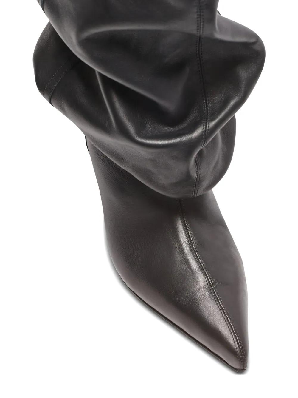 black calfskin leather slouchy shaft pointed toe wedge heel gold-tone logo detail