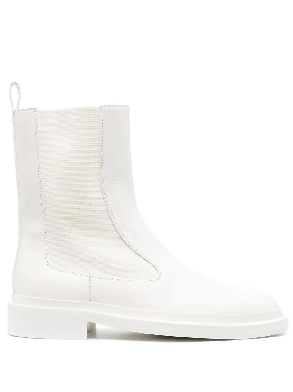 natural white leather ankle-length pull-on style pull-tab at the heel round toe flat leather sole