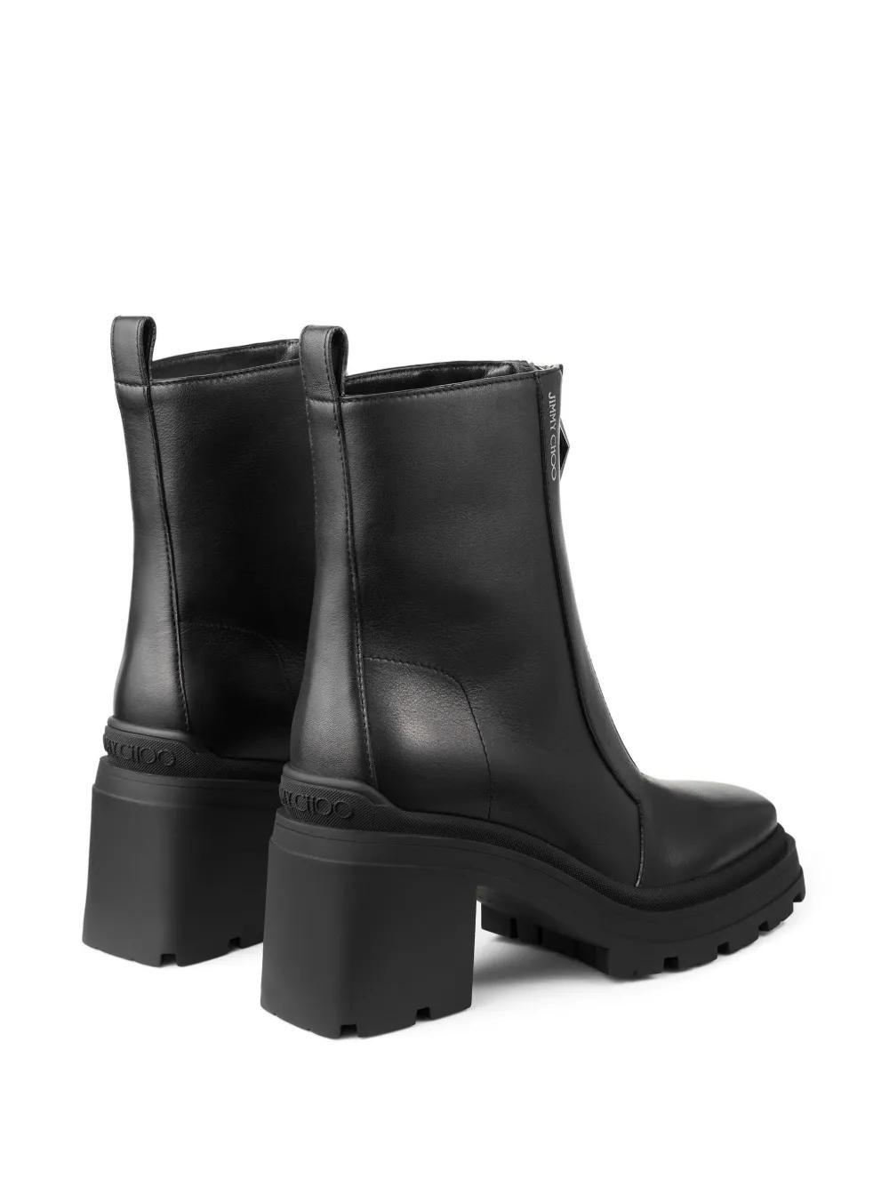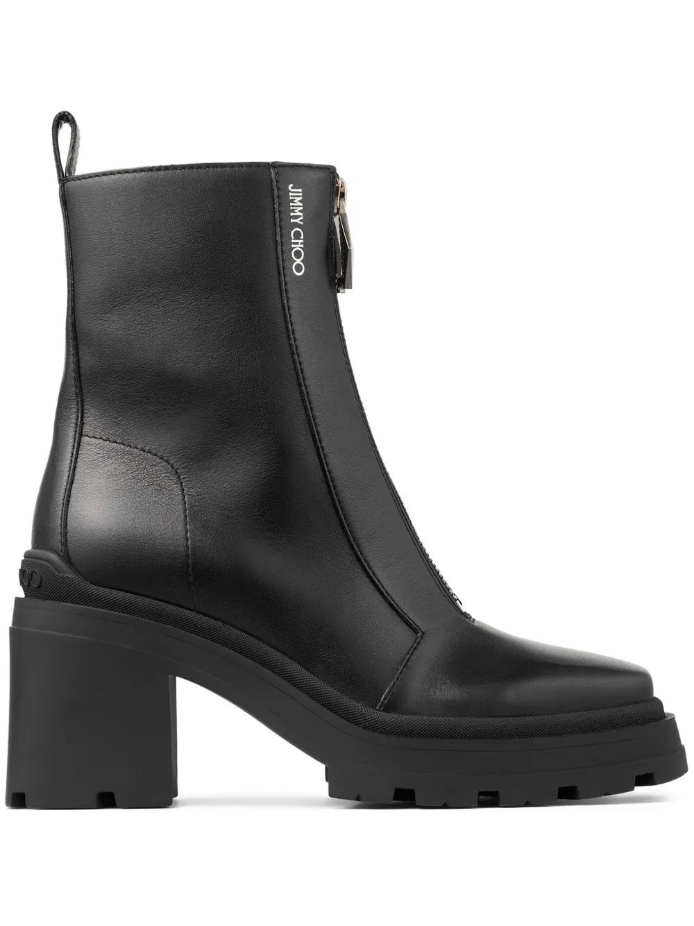 black calf leather logo print to the side silver-tone hardware pull-tab at the heel front zip fastening ankle-length square toe high block heel