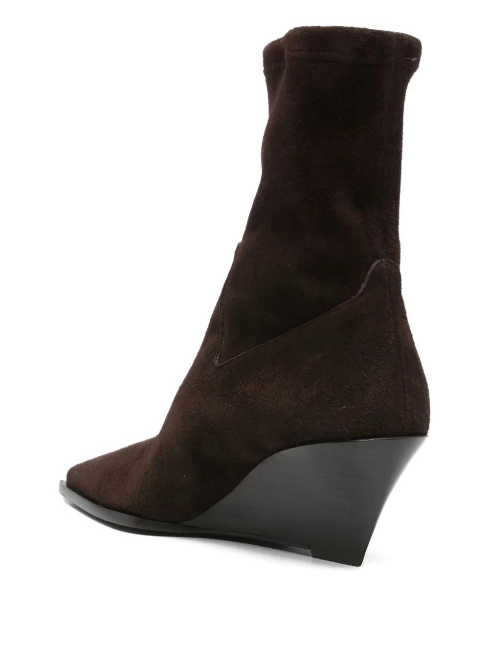 brown suede upper wedge heel pointed toe sock-like topline pull-on style