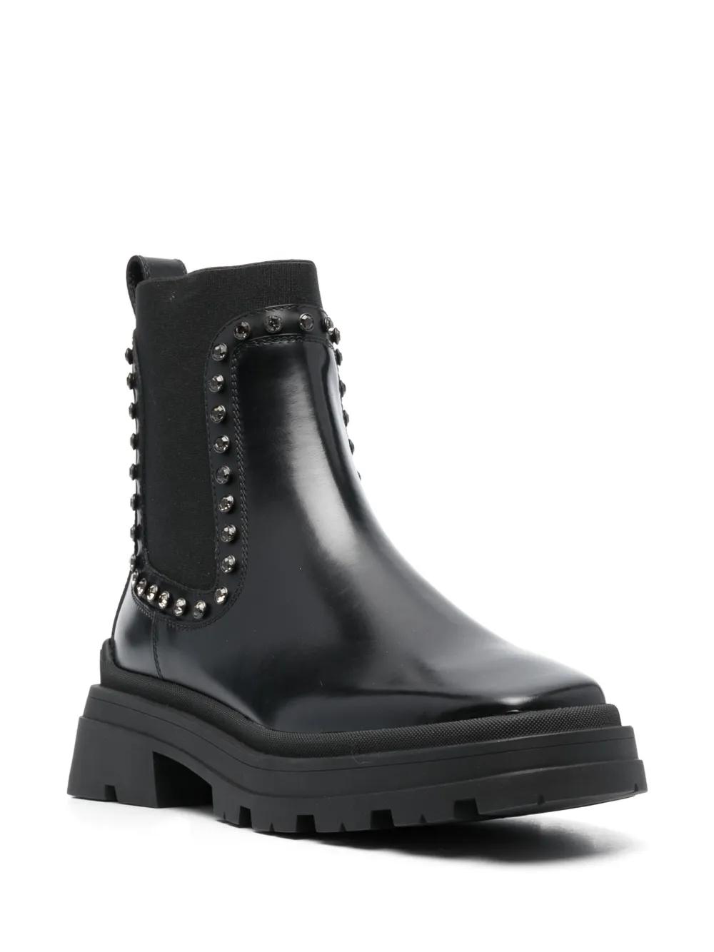 black calf leather silver-tone logo plaque crystal embellishment square toe ankle-length elasticated side panels branded insole flat rubber sole